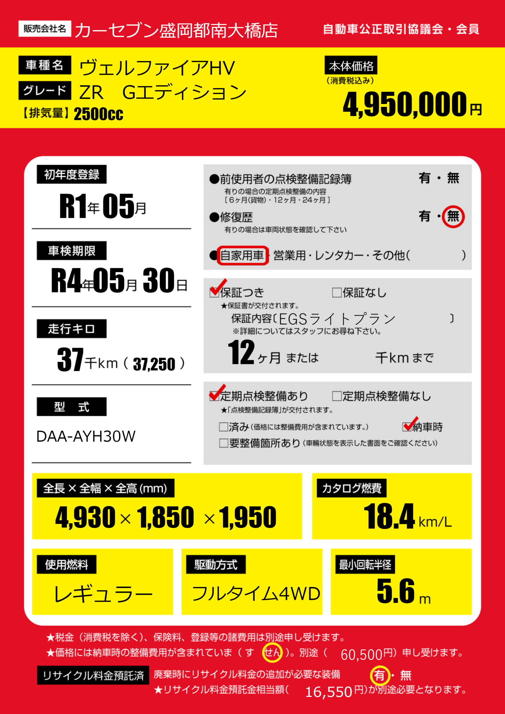 | 車名 | ヴェルファイアHV | グレード ミッション 排気量 |