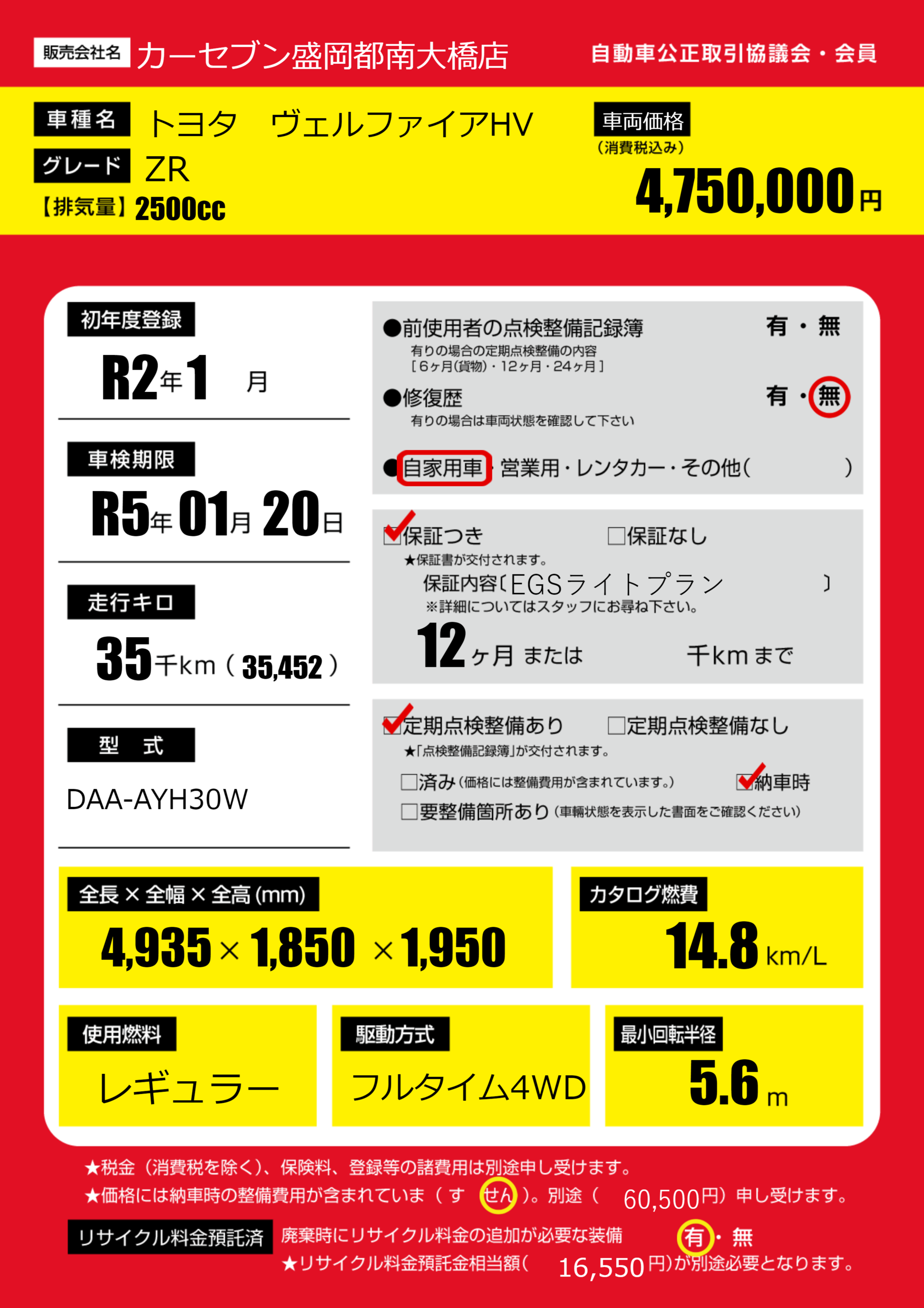 保証付き 保証内容(EGSライトプラン) 12ヶ月または()千kmまで |