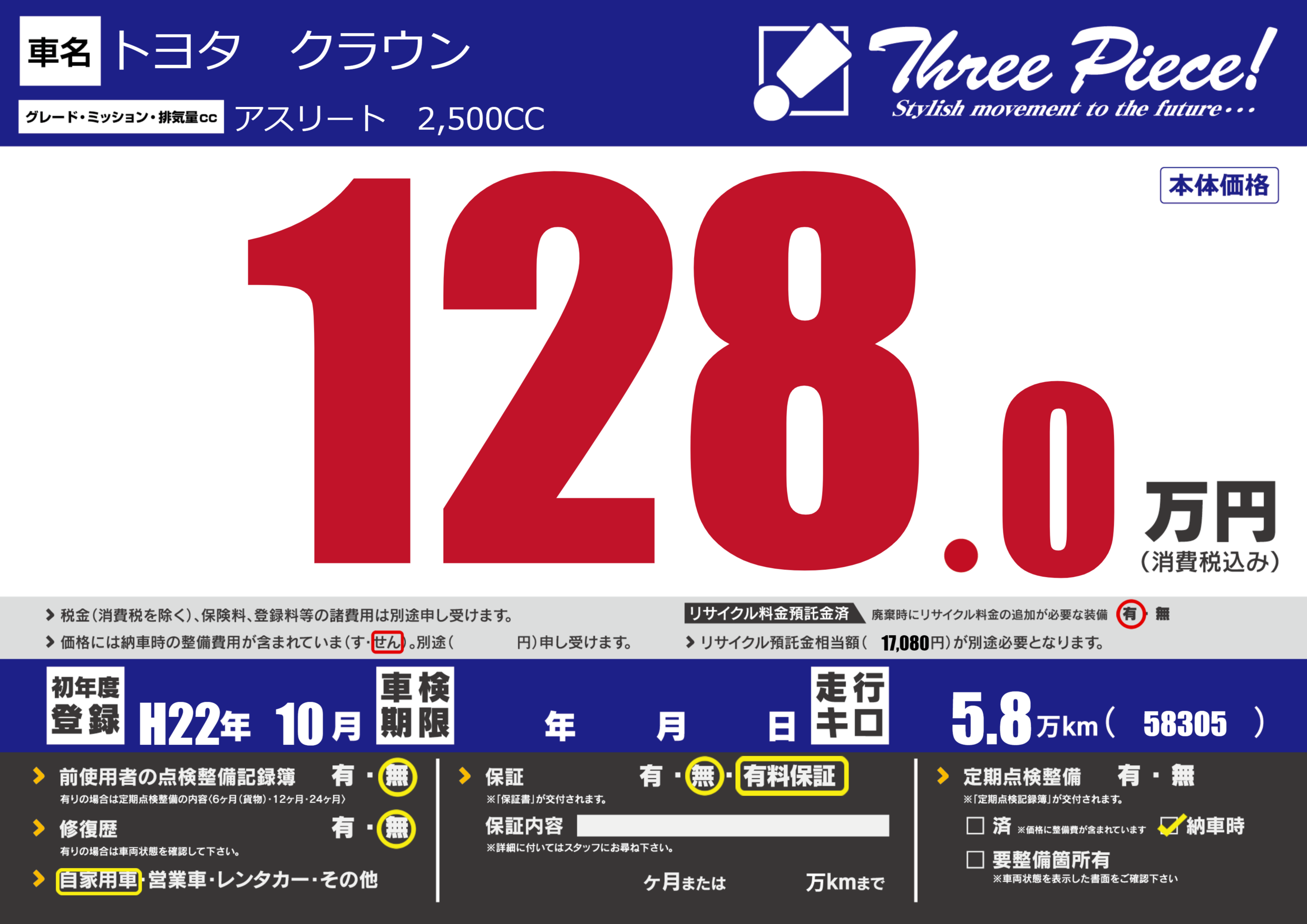 | 車名 | トヨタ クラウン | グレード ミッション 排気量 |