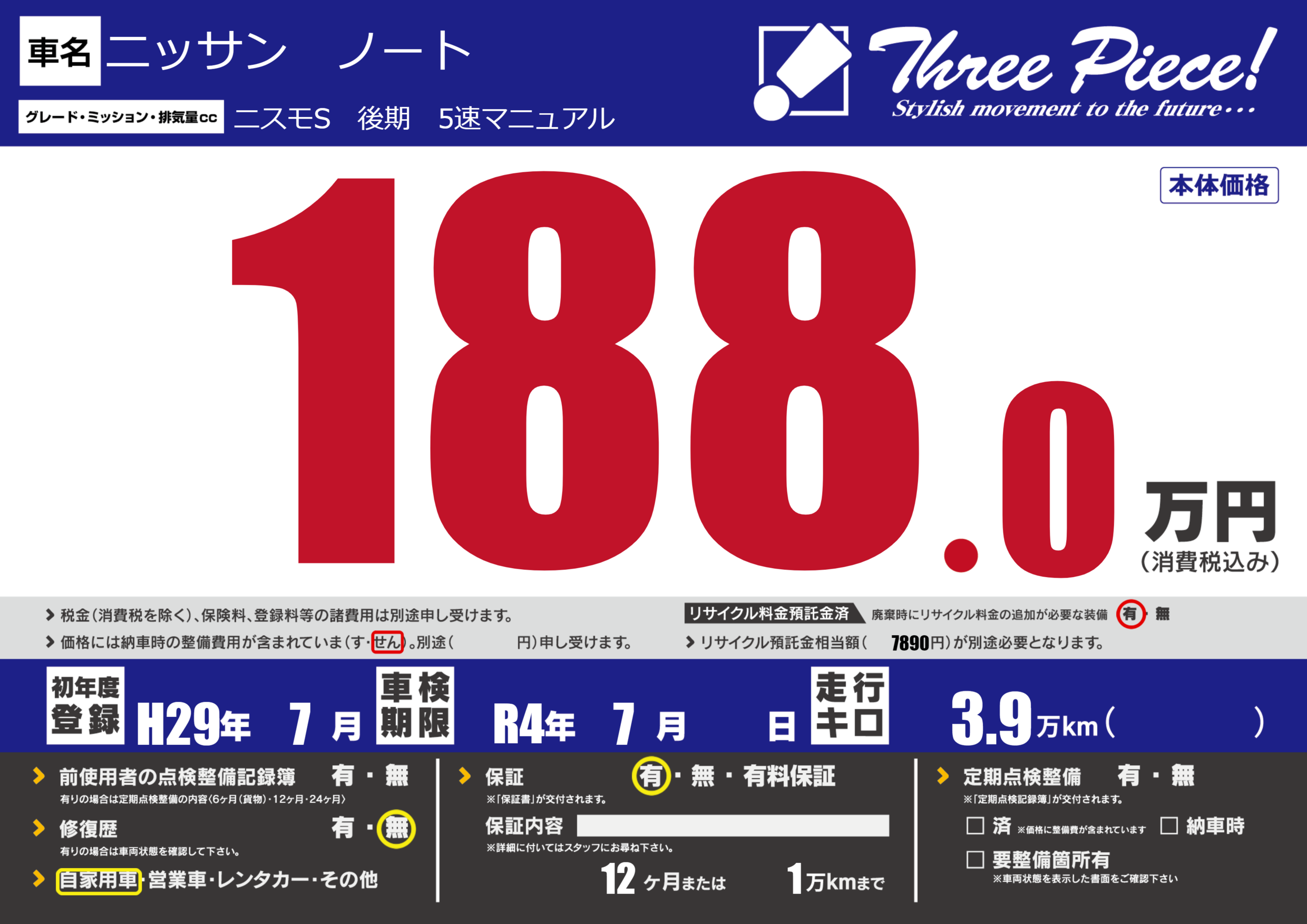 | 走行キロ | 0.3万km | 初年度登録 | H29年7月 |