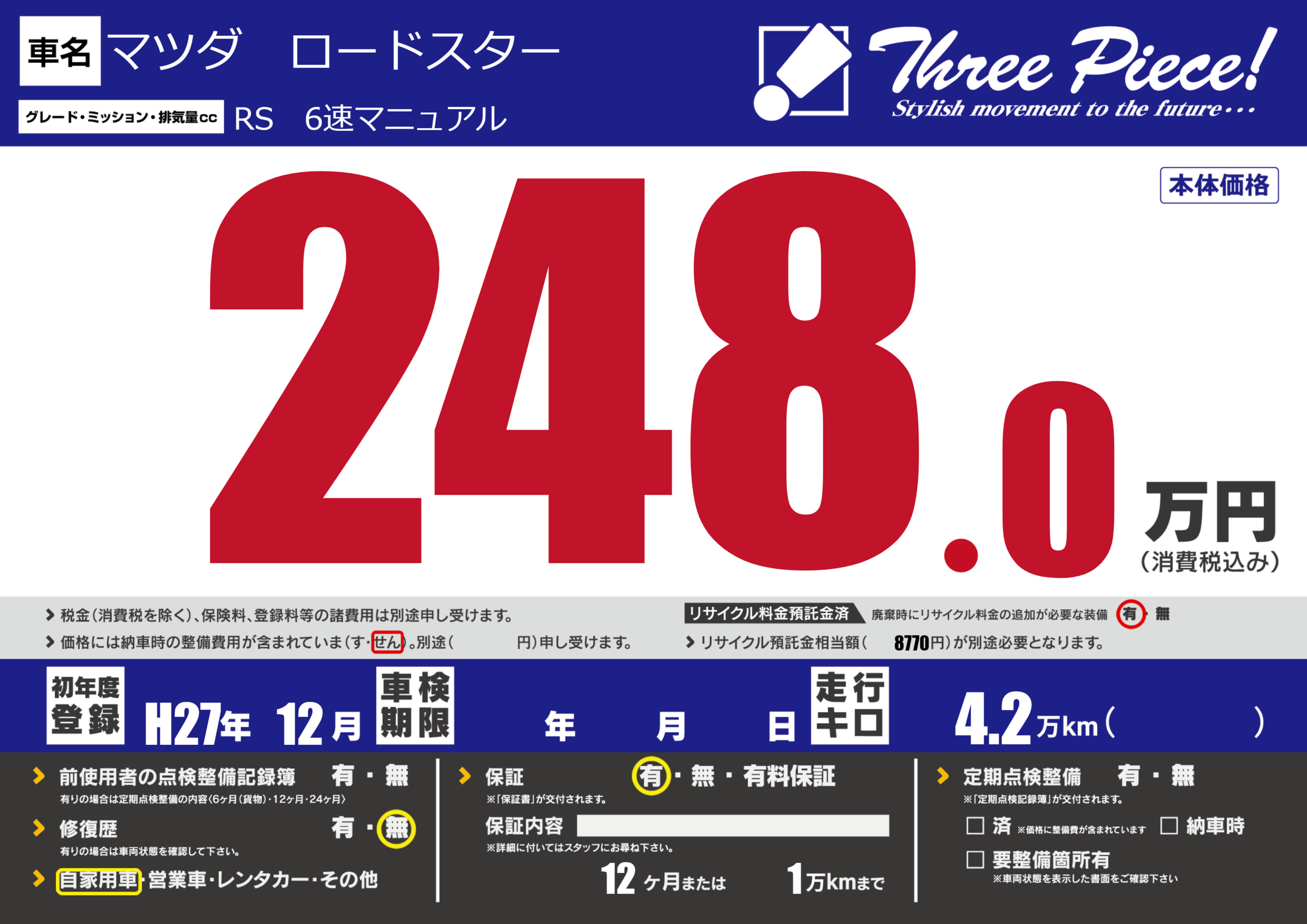 | 車名 | マツダ ロードスター | グレード ミッション 排気量 |
