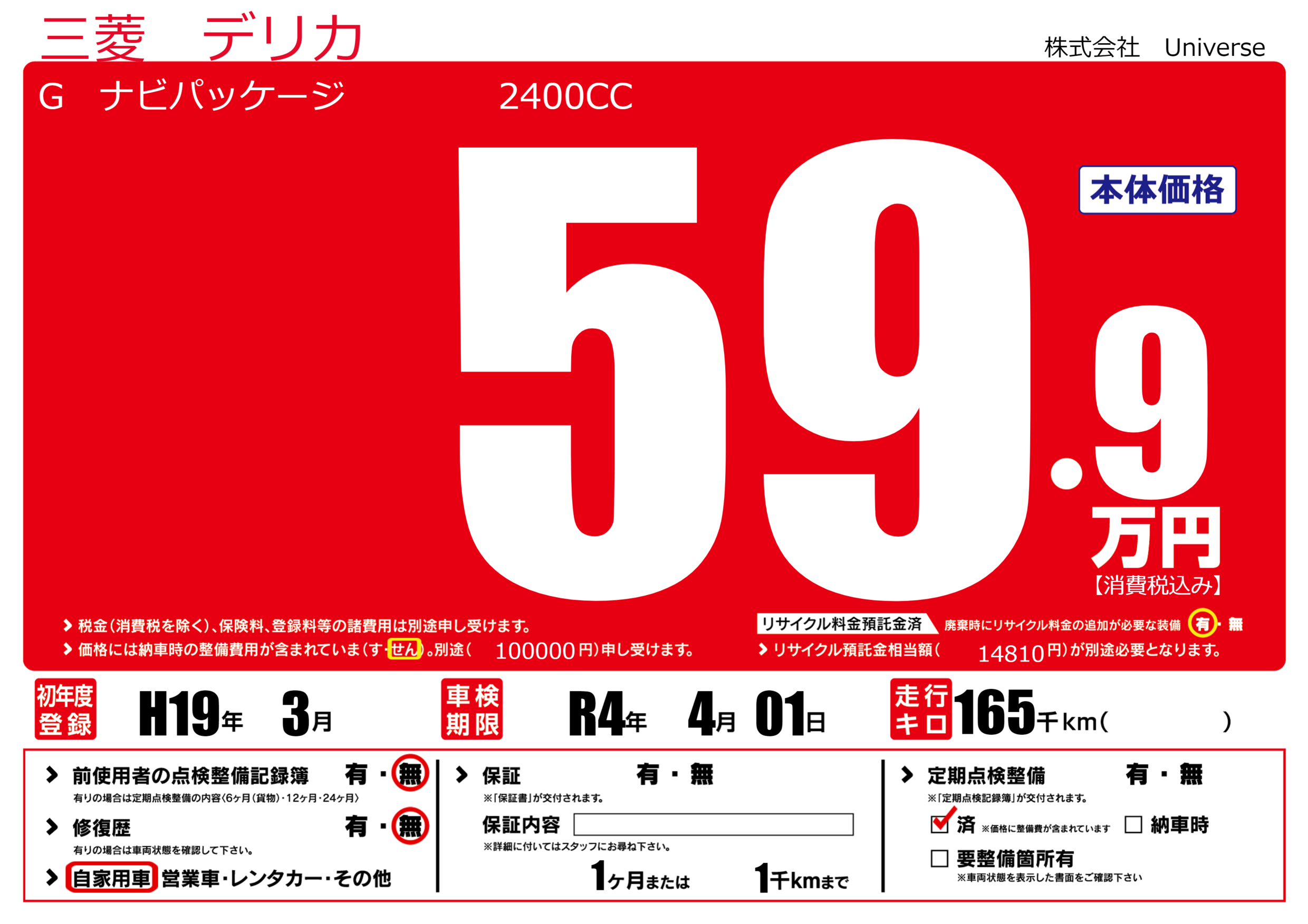 | 定期点検整備 | 定期点検整備済み | ||