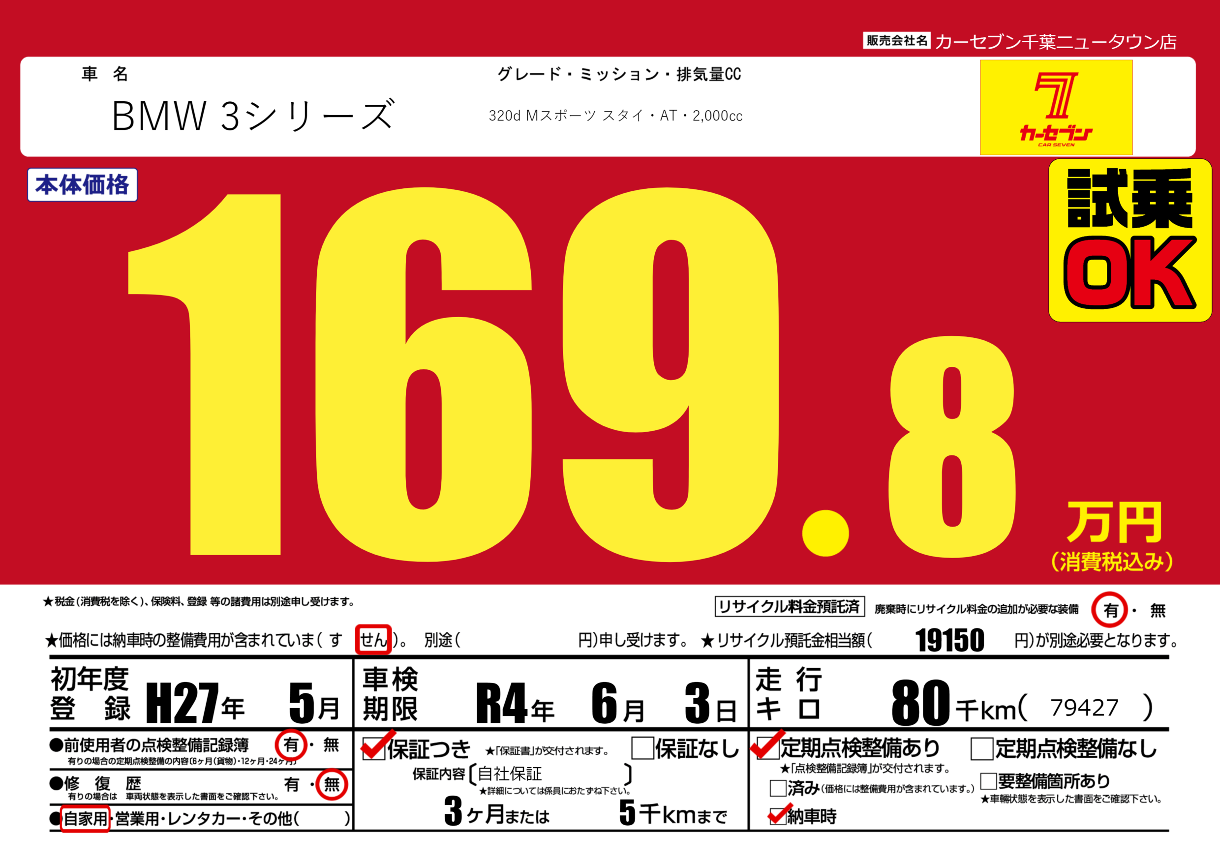 | 車名 | BMW 3シリーズ | グレード ミッション 排気量 |