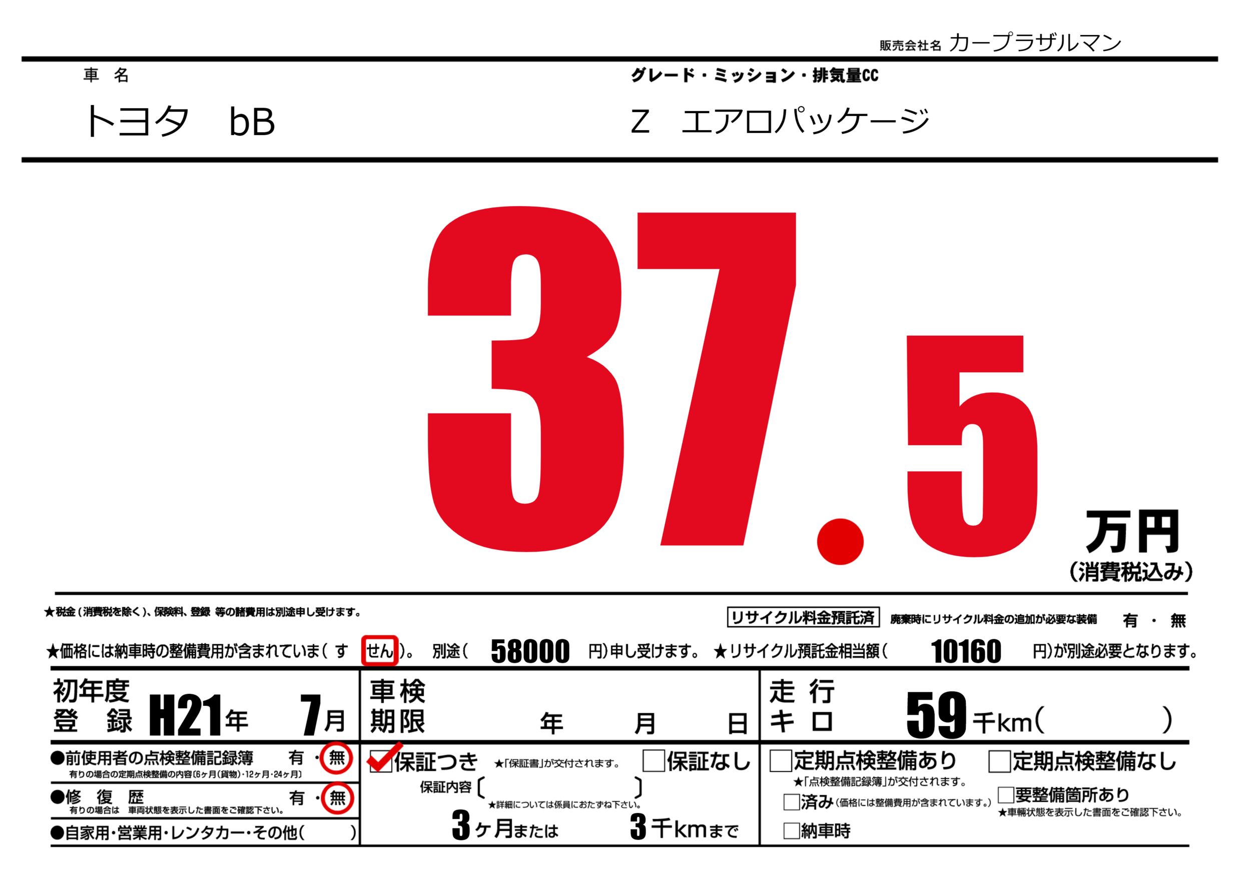 | 車名 | トヨタ bB | グレード ミッション 排気量 |