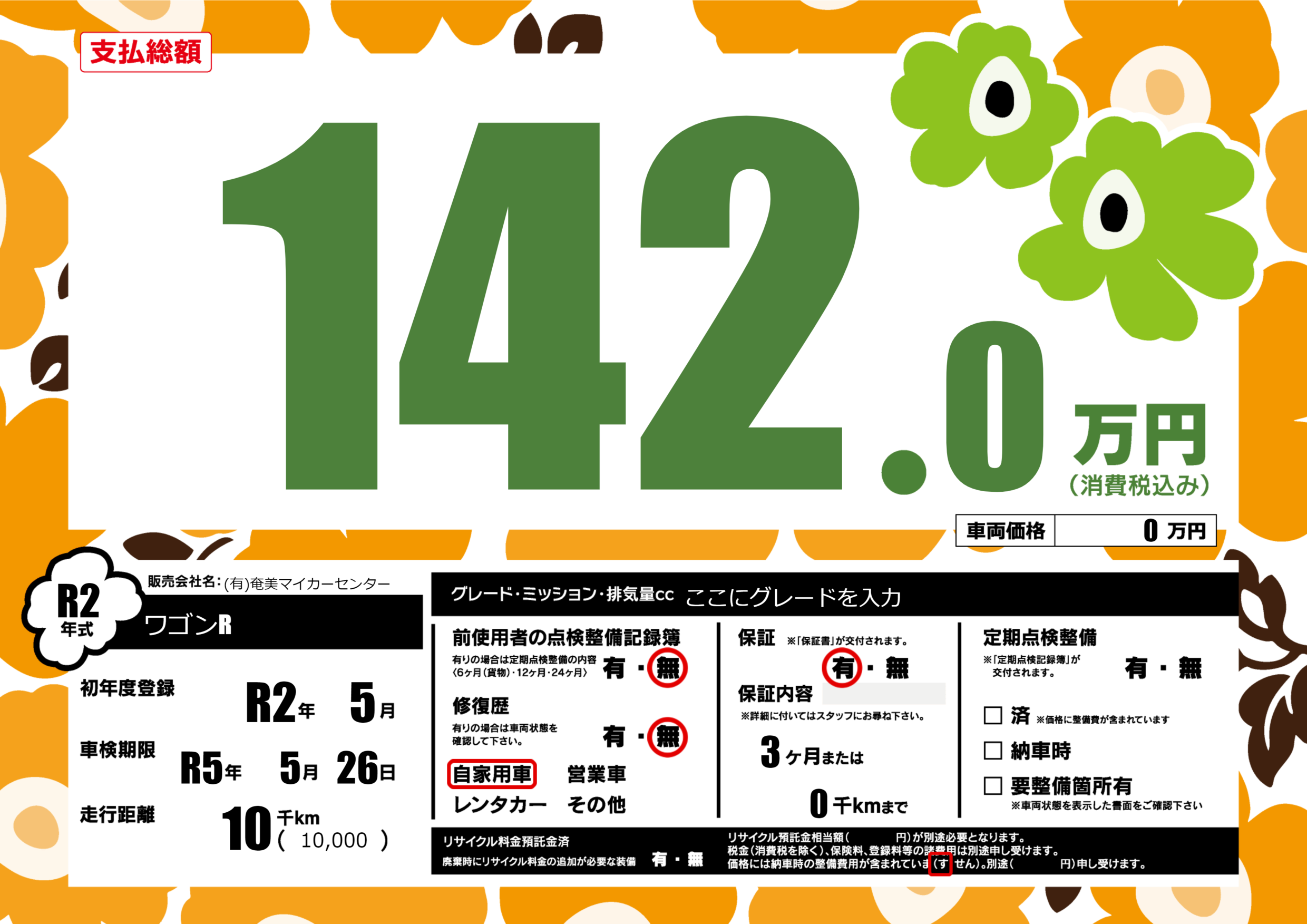 保証付き 保証内容(---) 3ヶ月または(0)千kmまで |