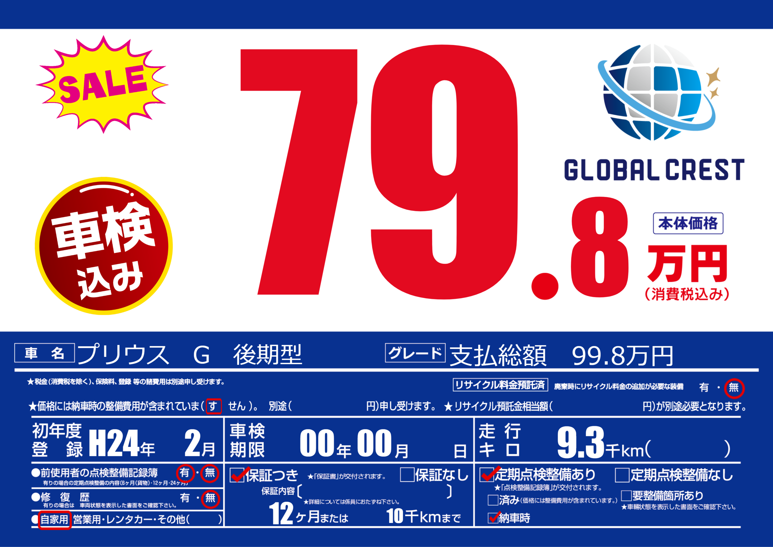 | 車名 | プリウス G 後期型 | グレード ミッション 排気量 |