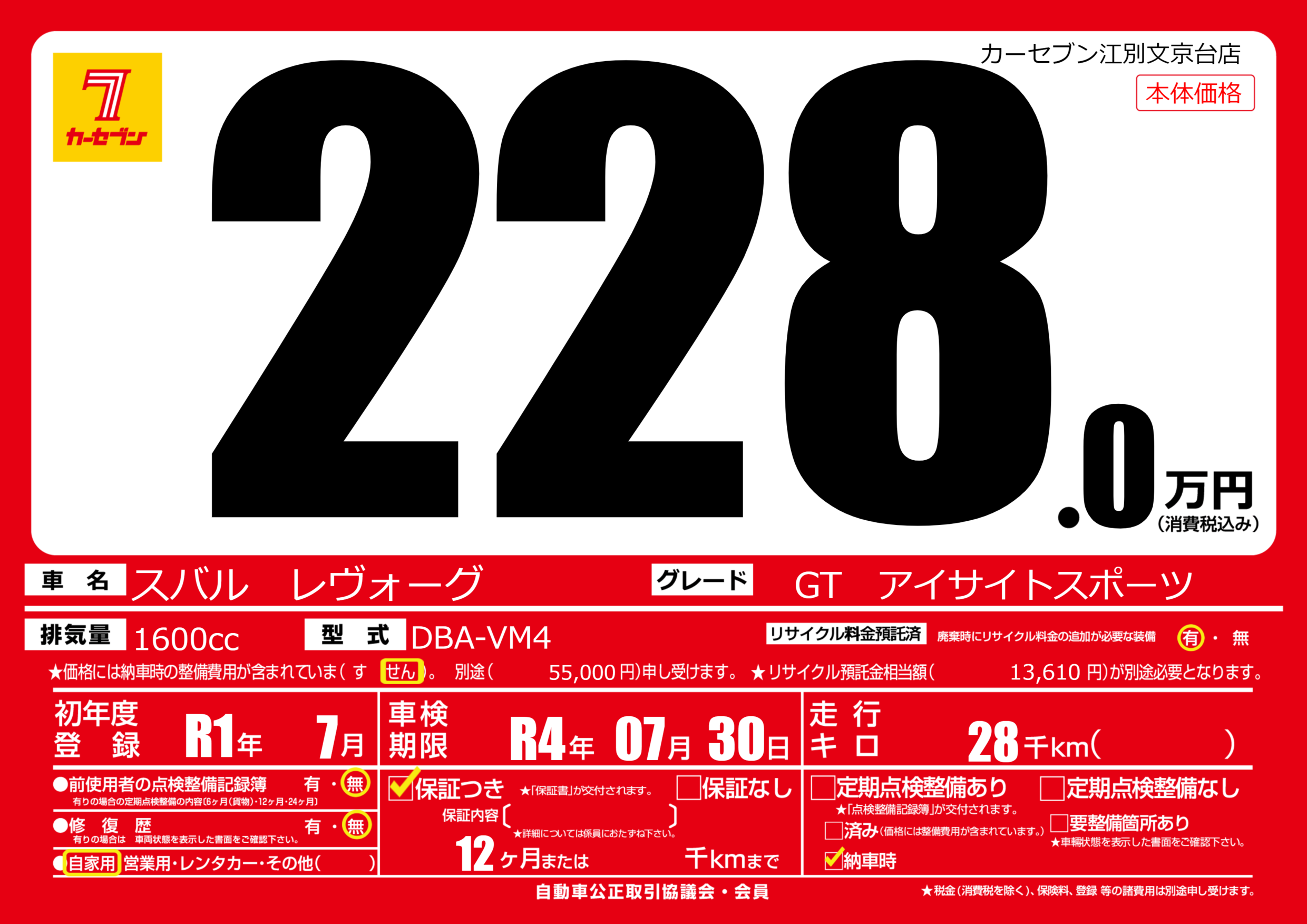 | 車名 | スバル レヴォーグ | グレード ミッション 排気量 |