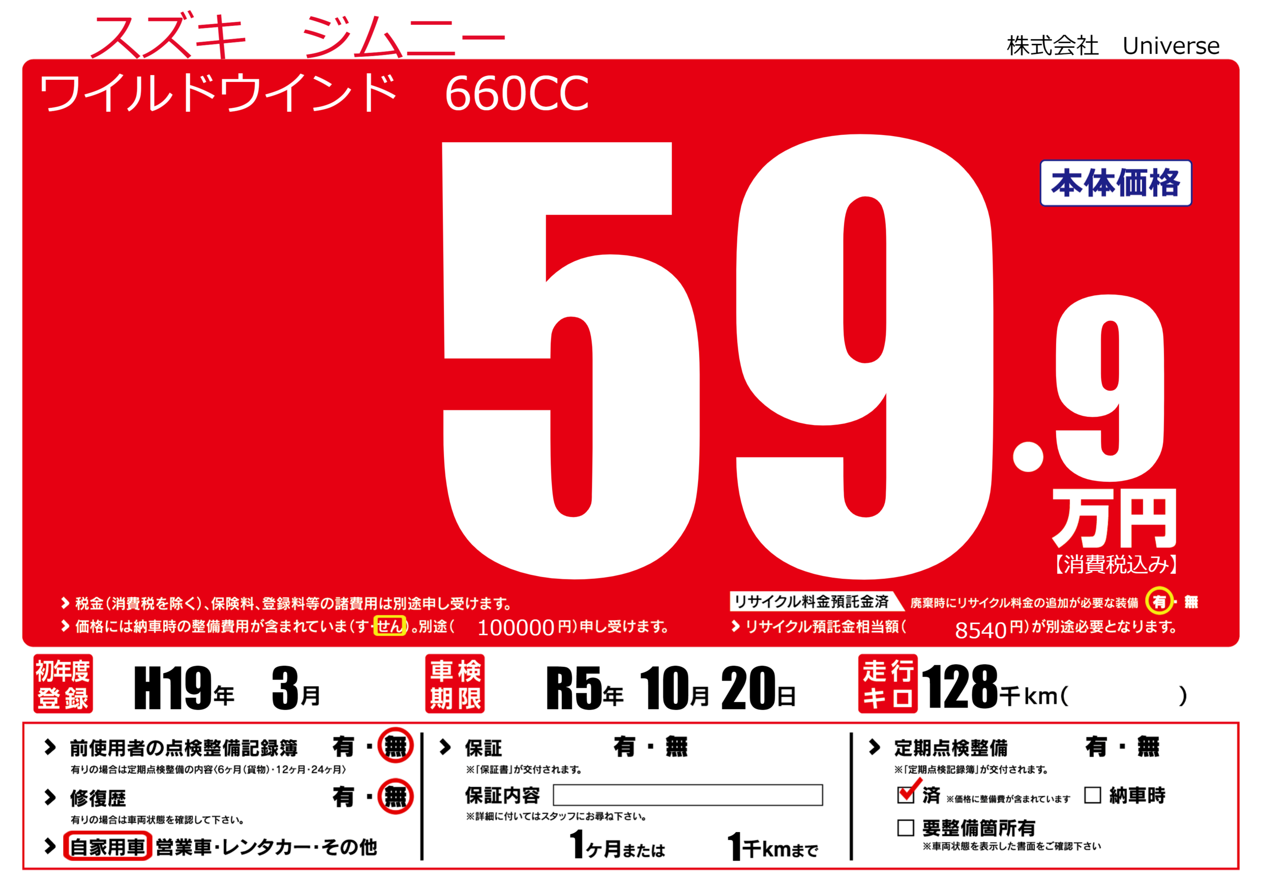 | 走行キロ | 12.8万km | 初年度登録 | H19年3月 |