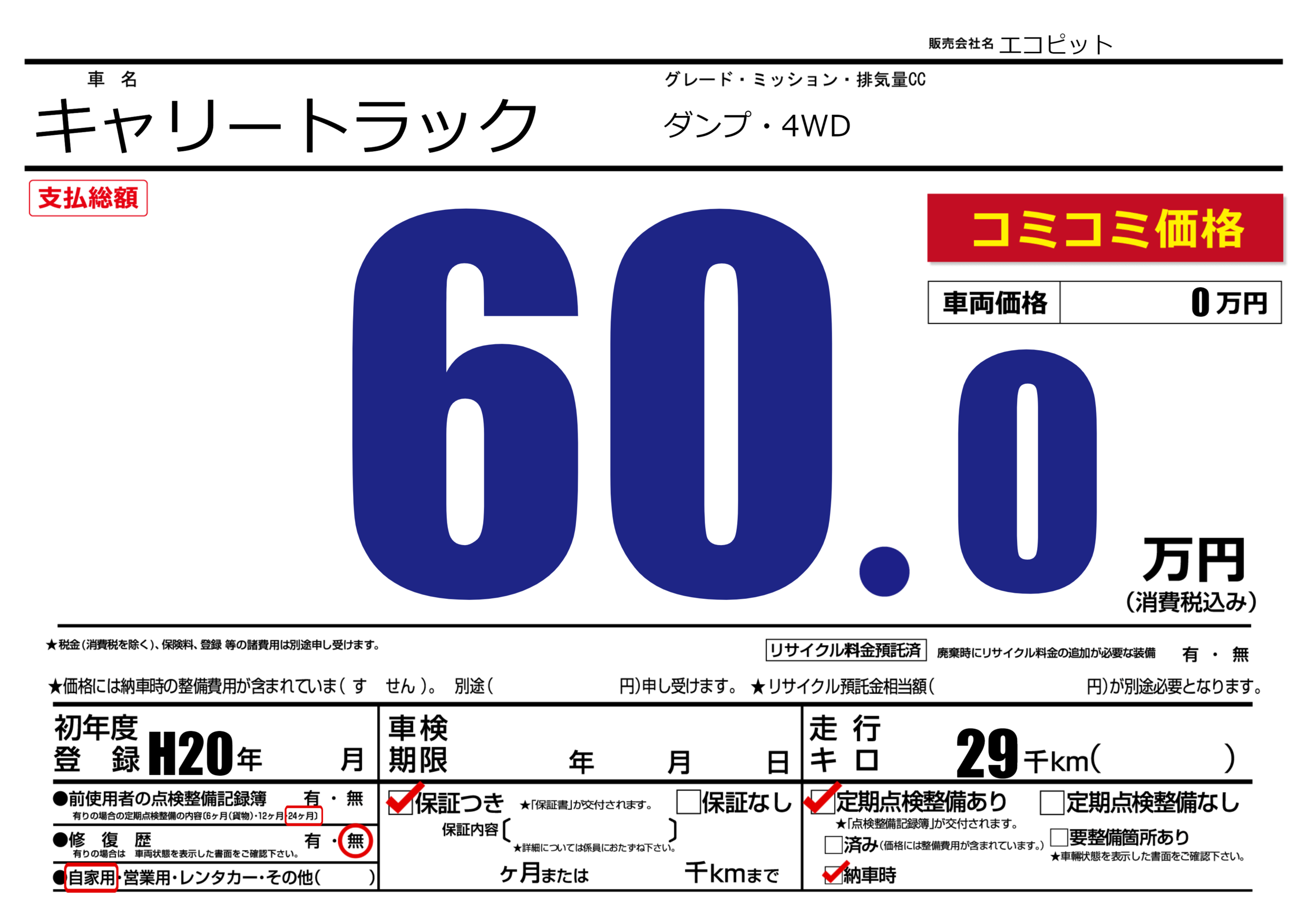 | 車名 | キャリートラック | グレード ミッション 排気量 |