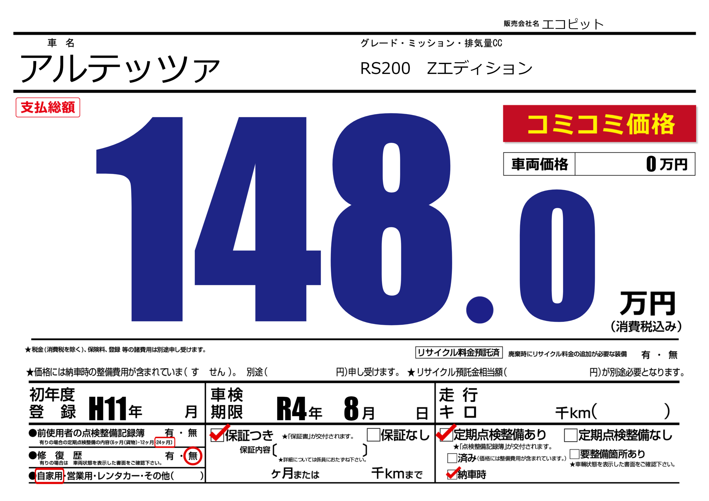 | 車名 | アルテッツァ | グレード ミッション 排気量 |