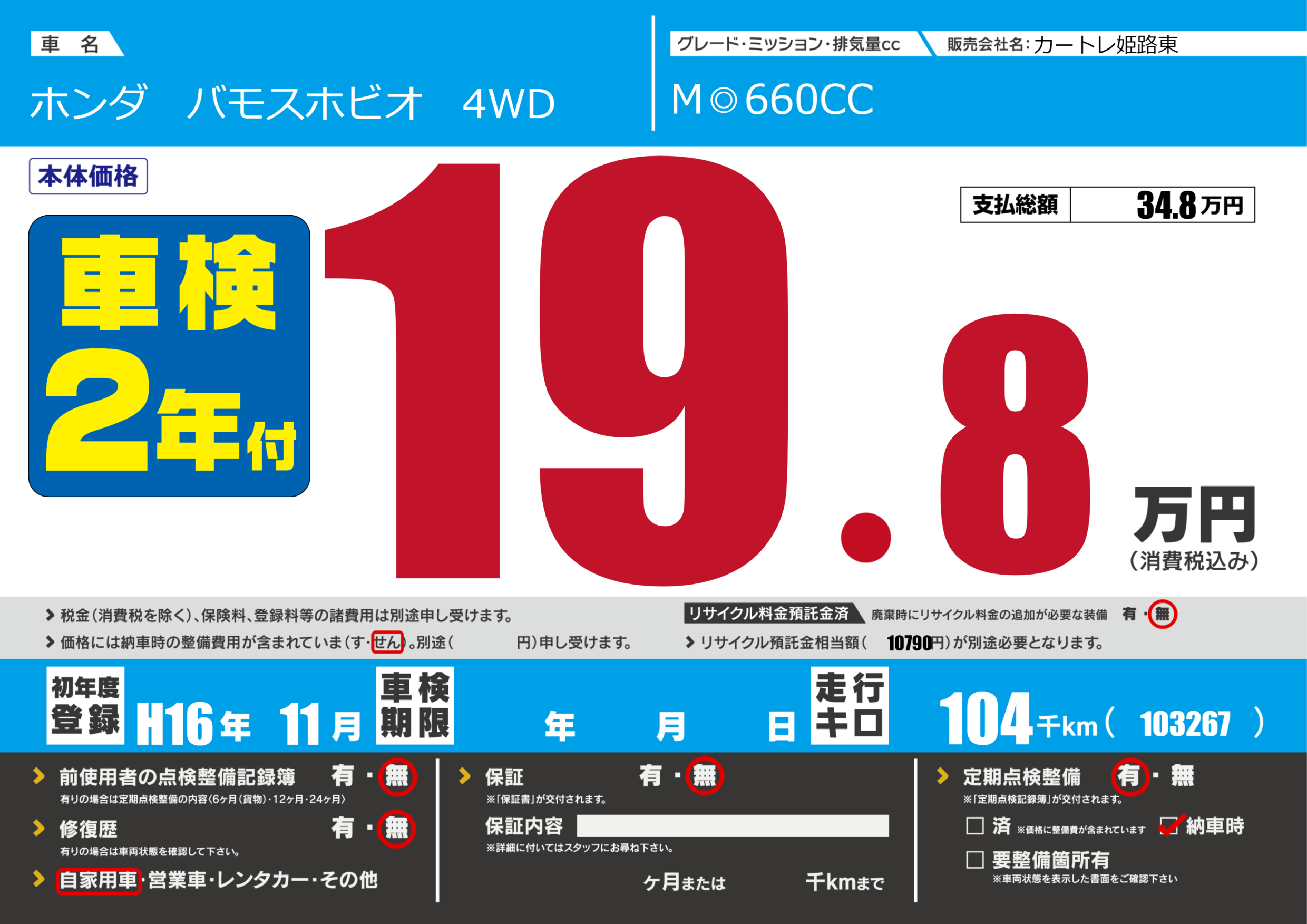 | 車名 | ホンダ バモスホビオ 4WD | グレード ミッション 排気量 |