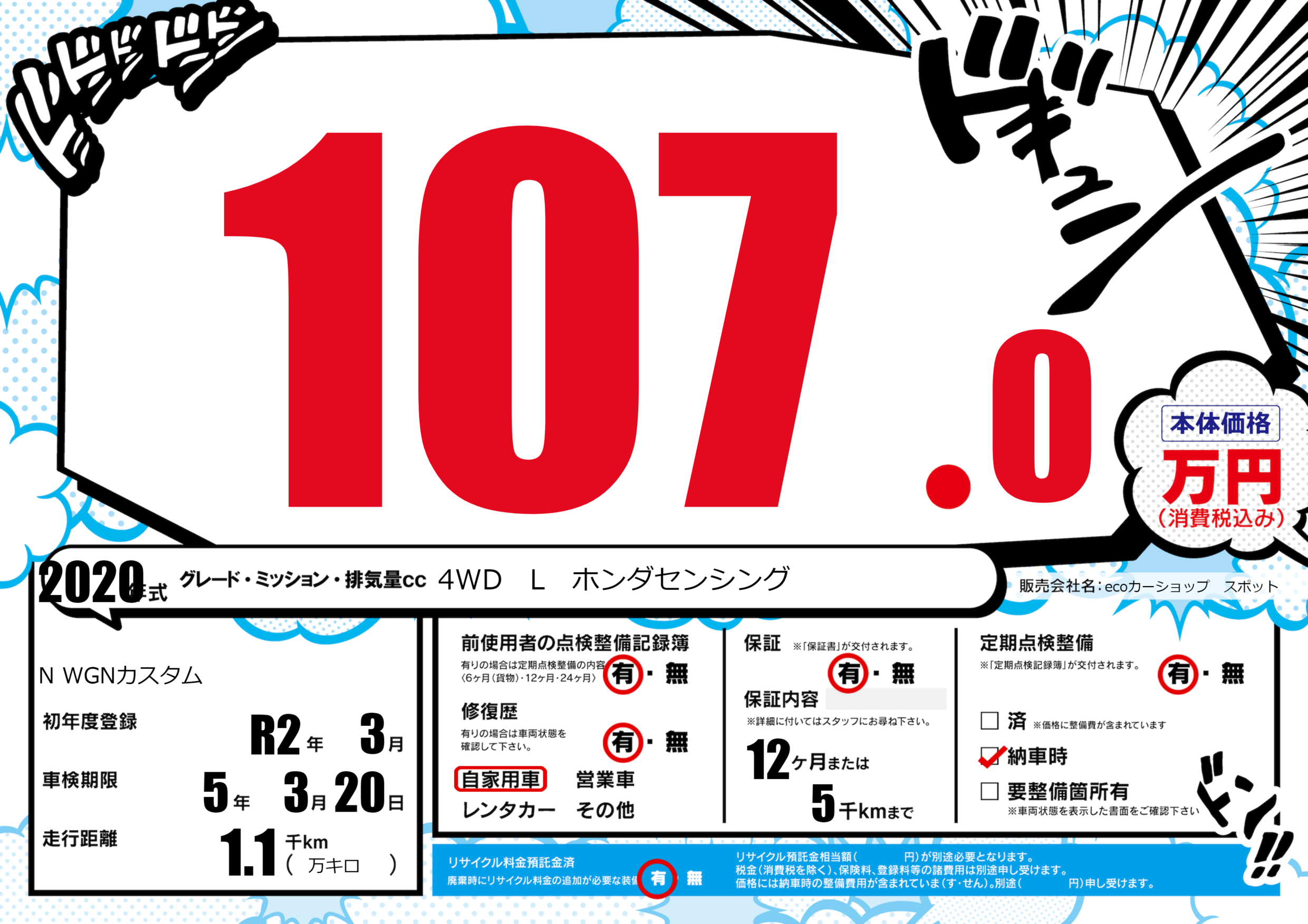 | 走行キロ | 0.1万km | 初年度登録 | R2年3月 |