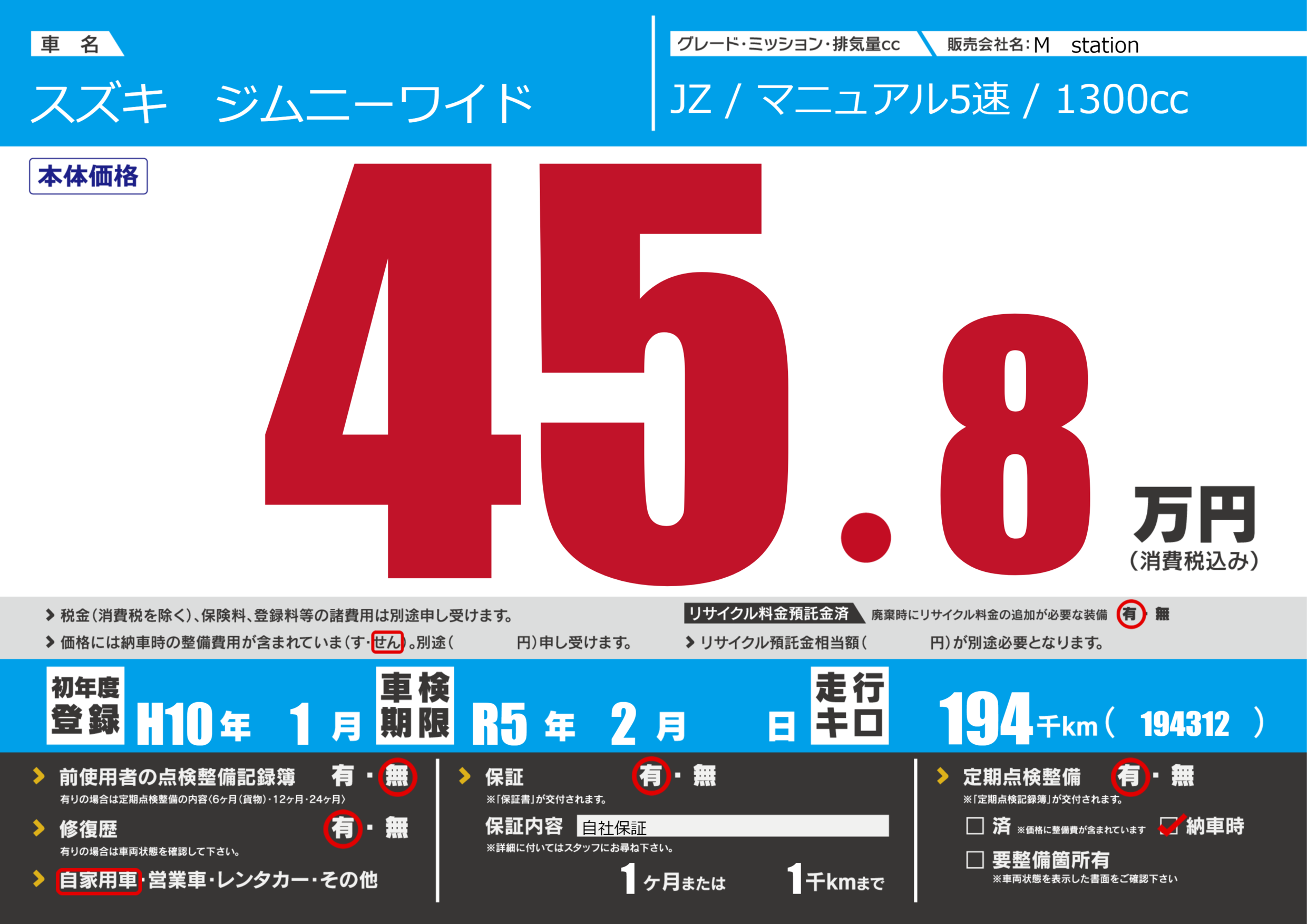 なし | 車検制限 | R5年2月---月 |