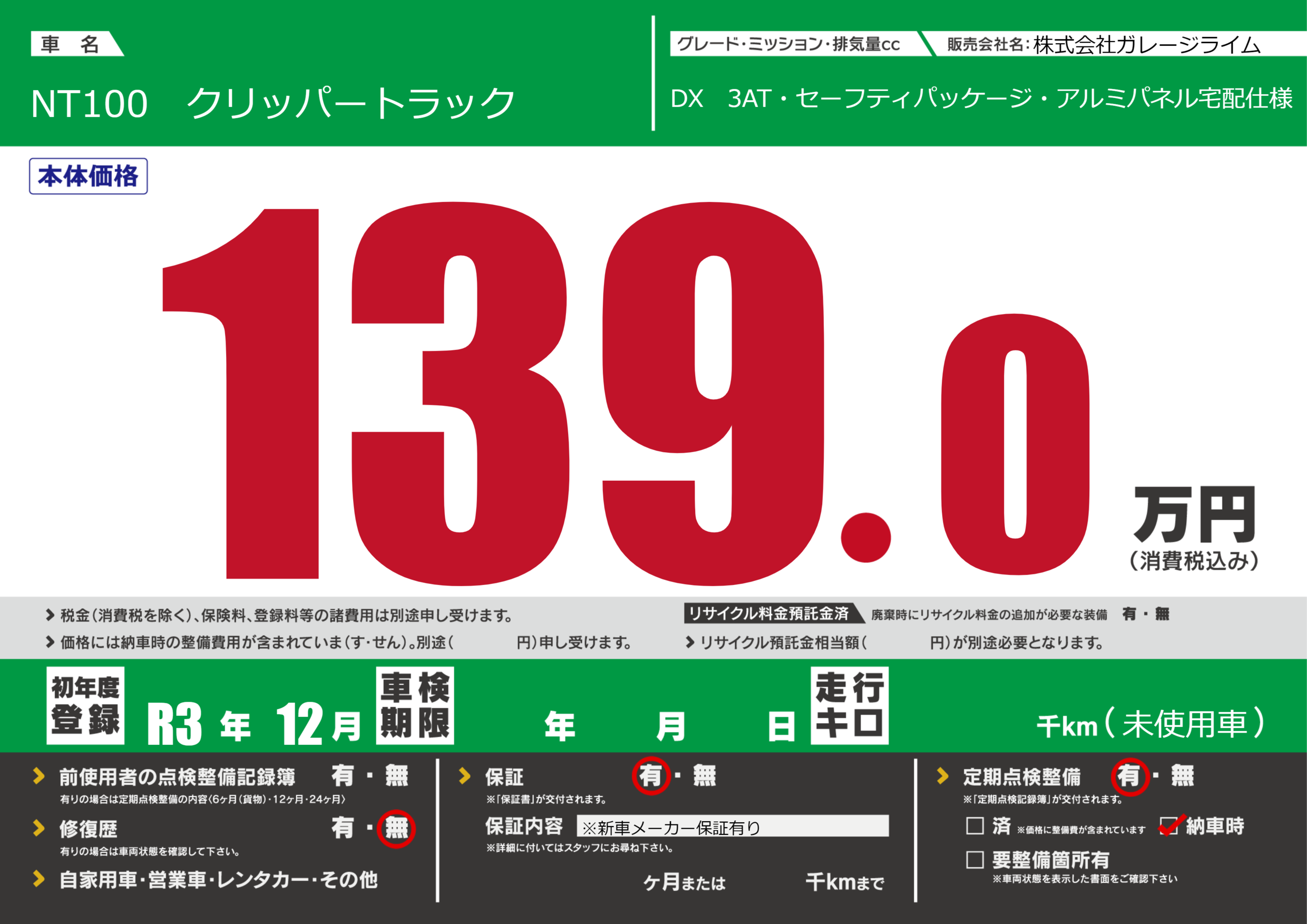 保証内容(※新車メーカー保証有り) ヶ月または千km