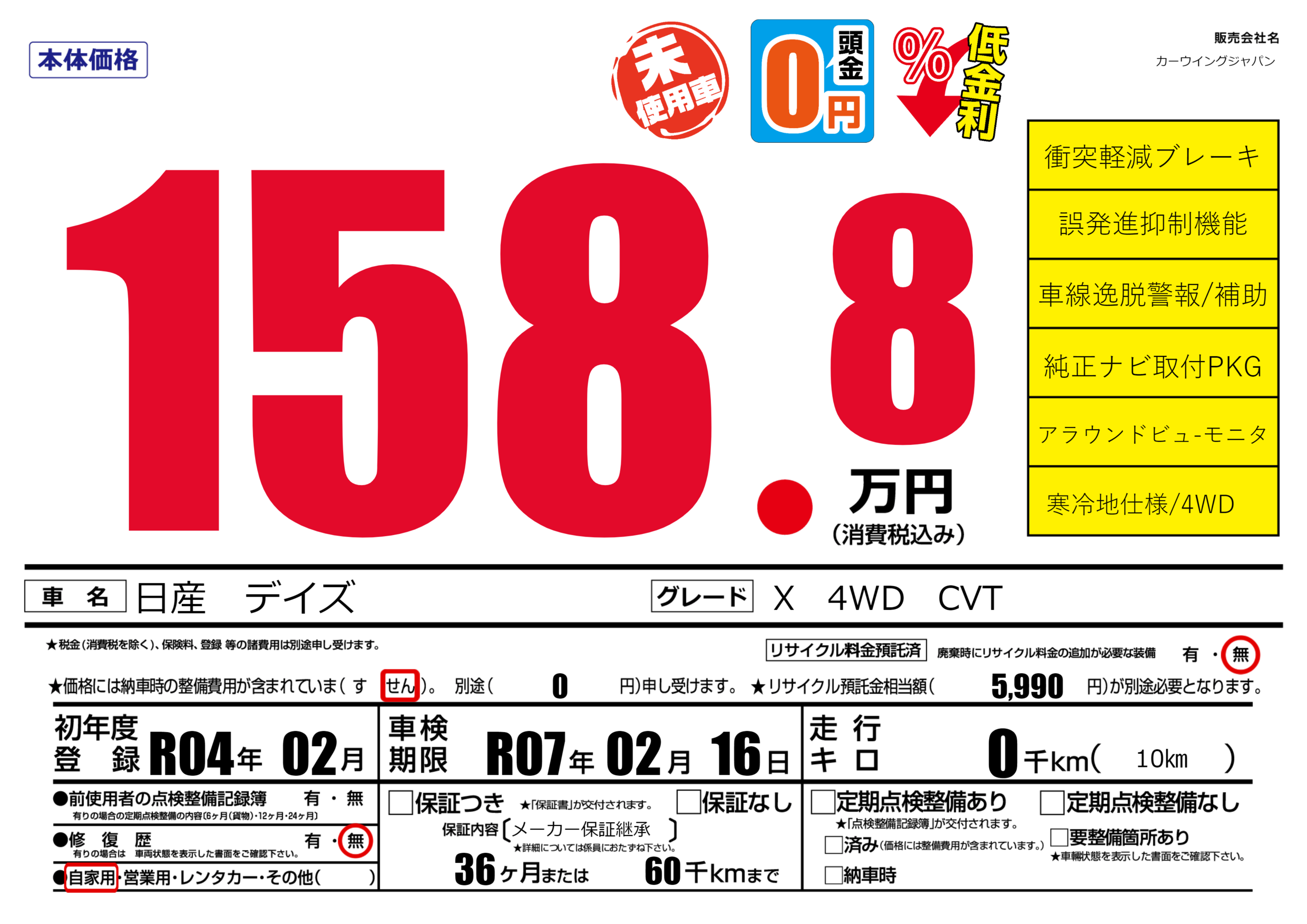 | 車名 | 日産 デイズ | グレード ミッション 排気量 |
