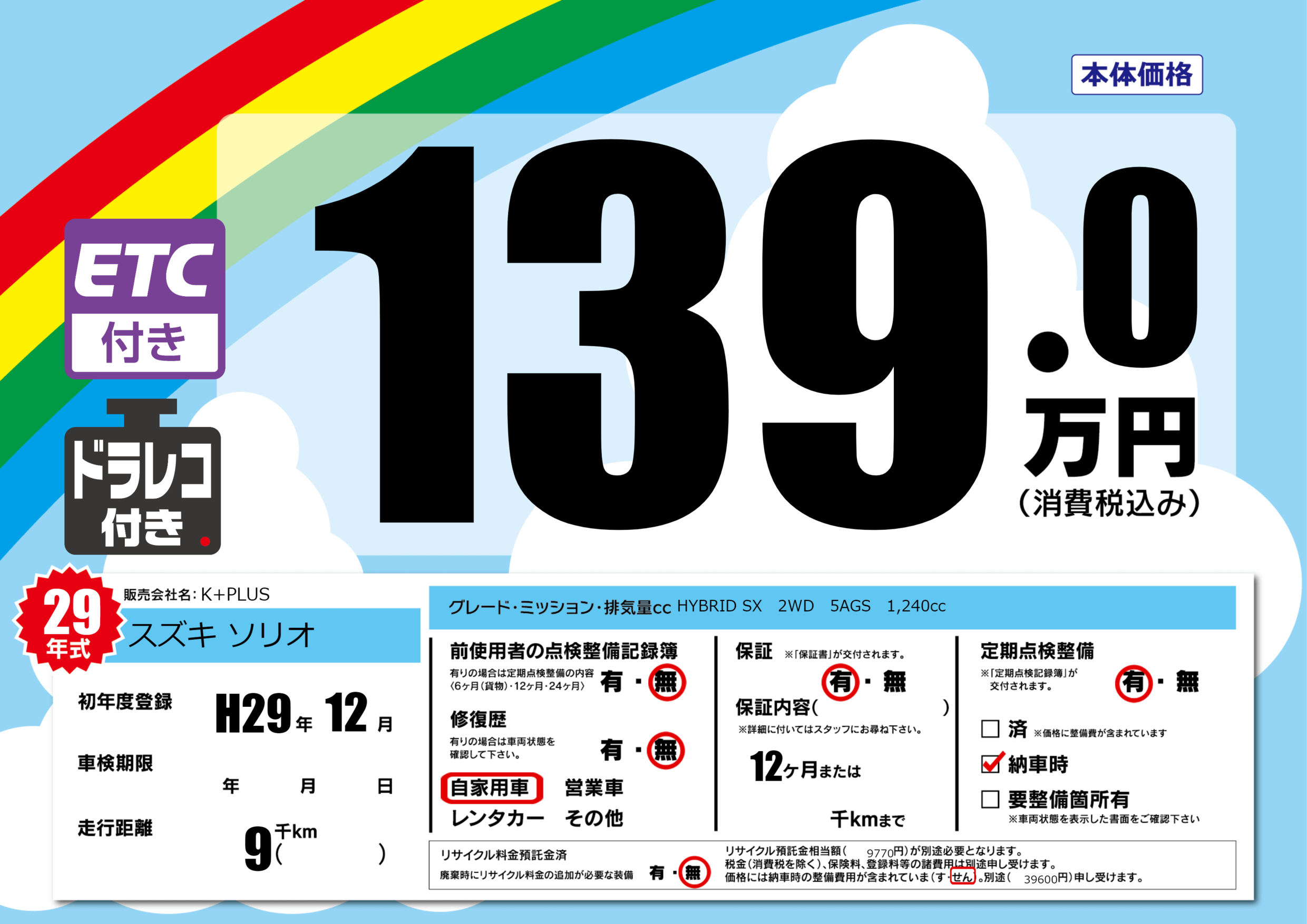 | 走行キロ | 0.9万km | 初年度登録 | H29年12月 |