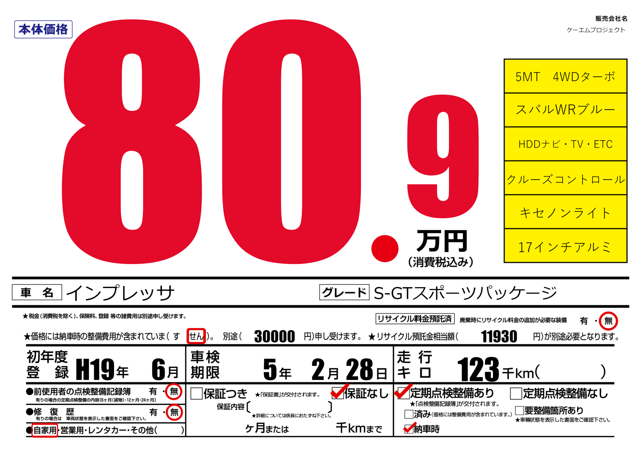 | 車名 | インプレッサ | グレード ミッション 排気量 |