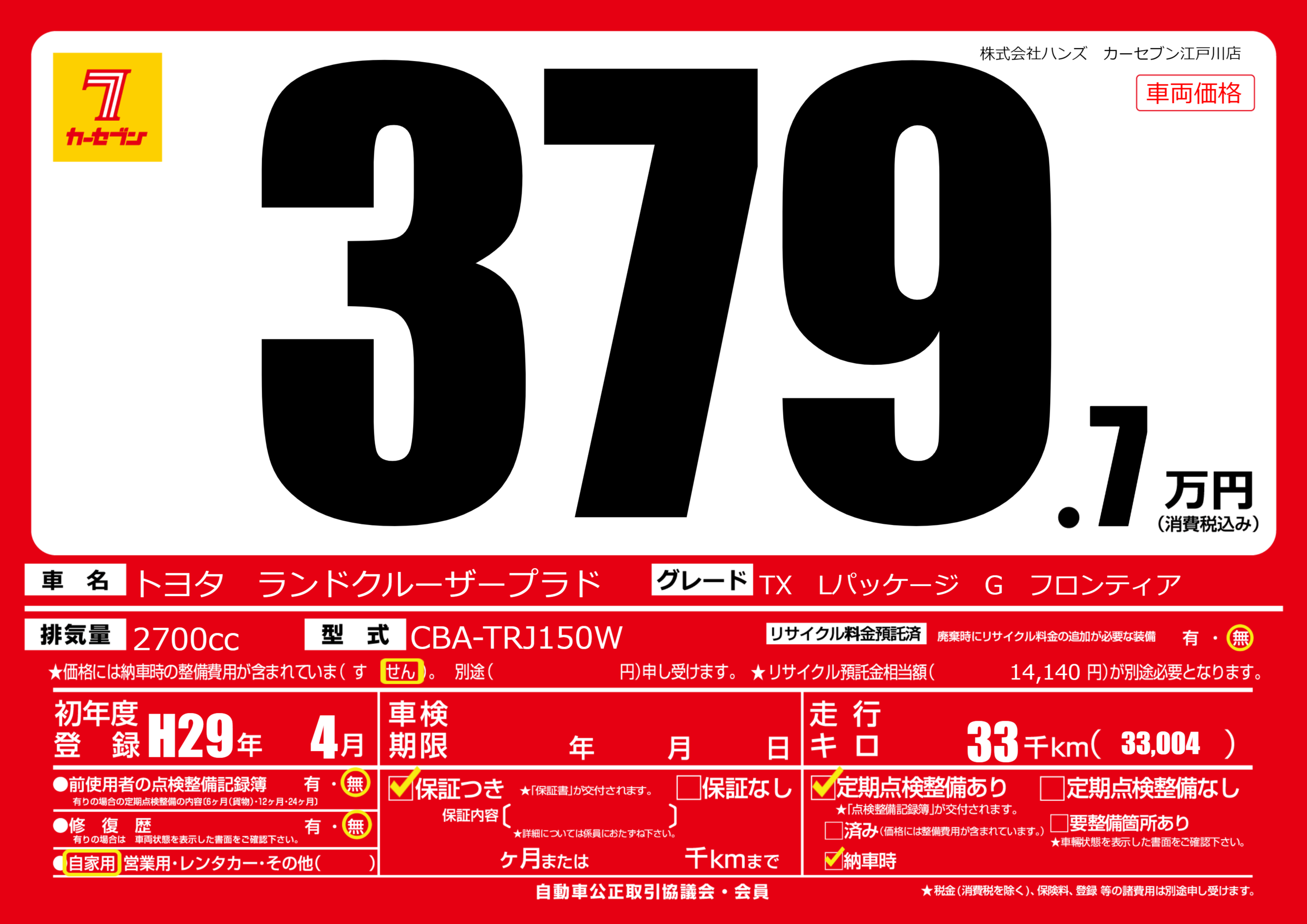 | 車名 | トヨタ ランドクルーザープラド | グレード ミッション 排気量 |