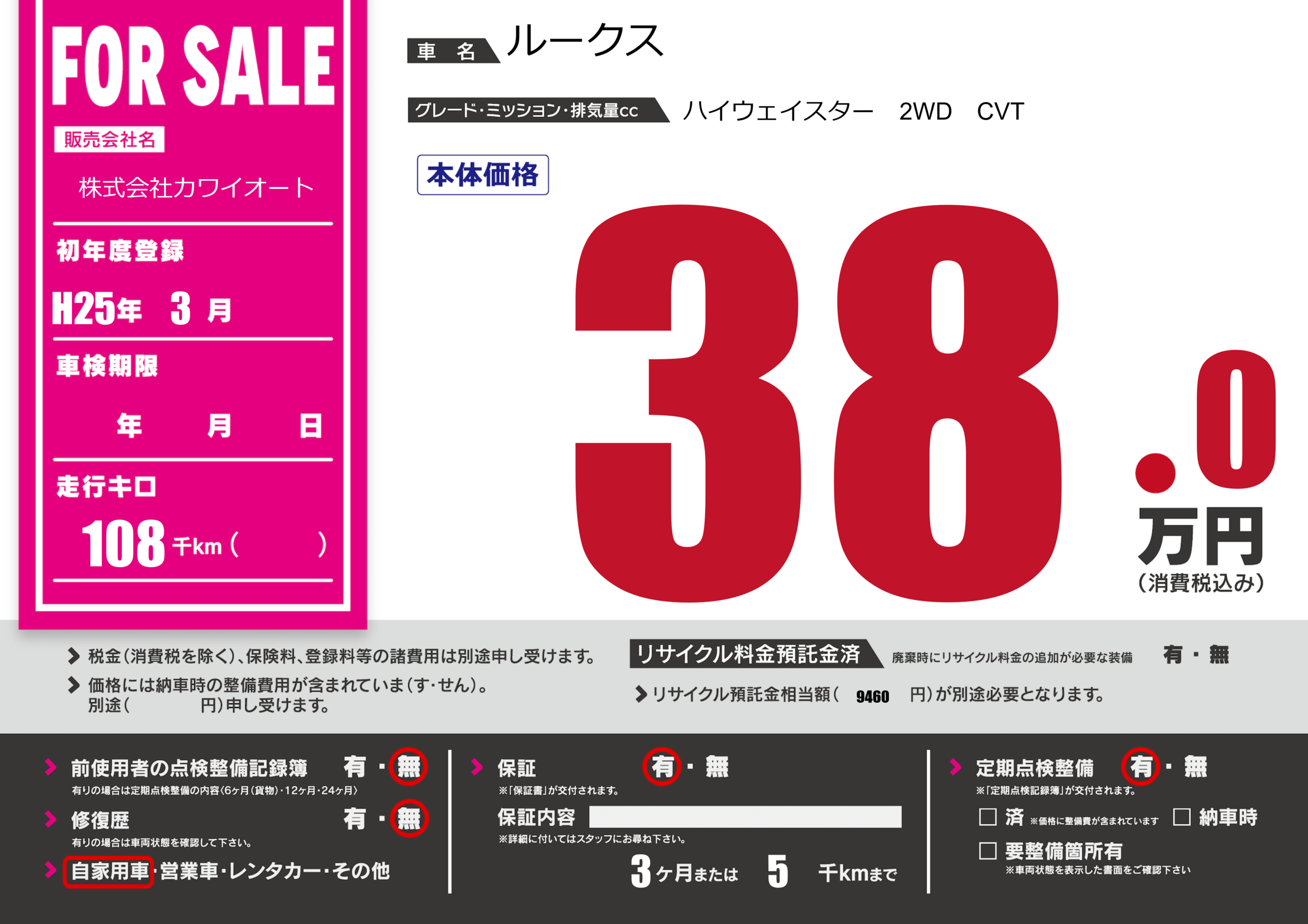 | 走行キロ | 10.8万km | 初年度登録 | H25年3月 |