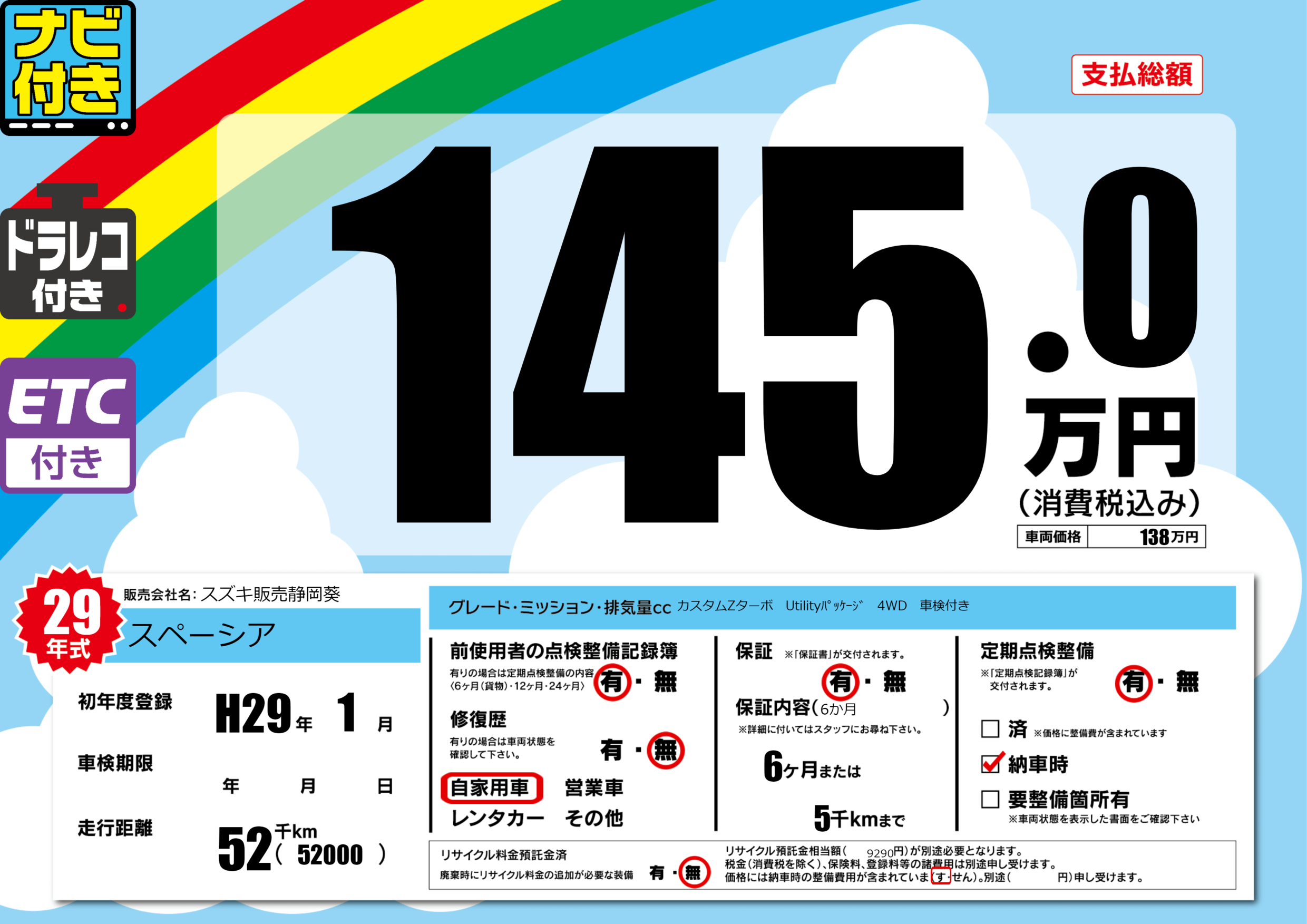 | 走行キロ | 5.2万km | 初年度登録 | H29年1月 |