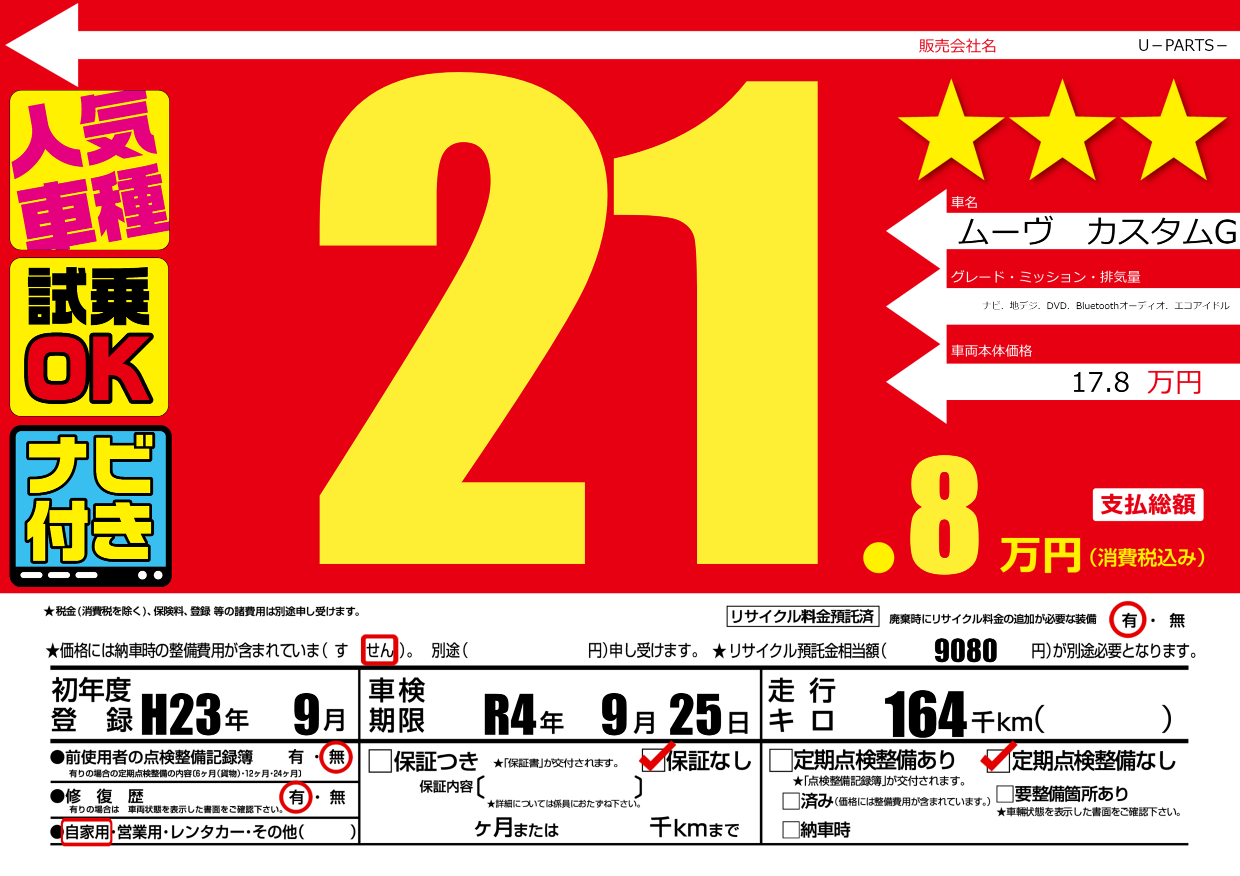 | 車名 | ムーヴ カスタムG | グレード ミッション 排気量 |