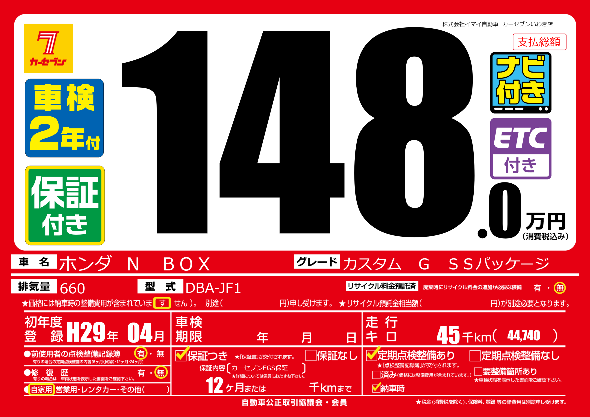 保証付き 保証内容(カーセブンEGS保証) 12ヶ月または千km |