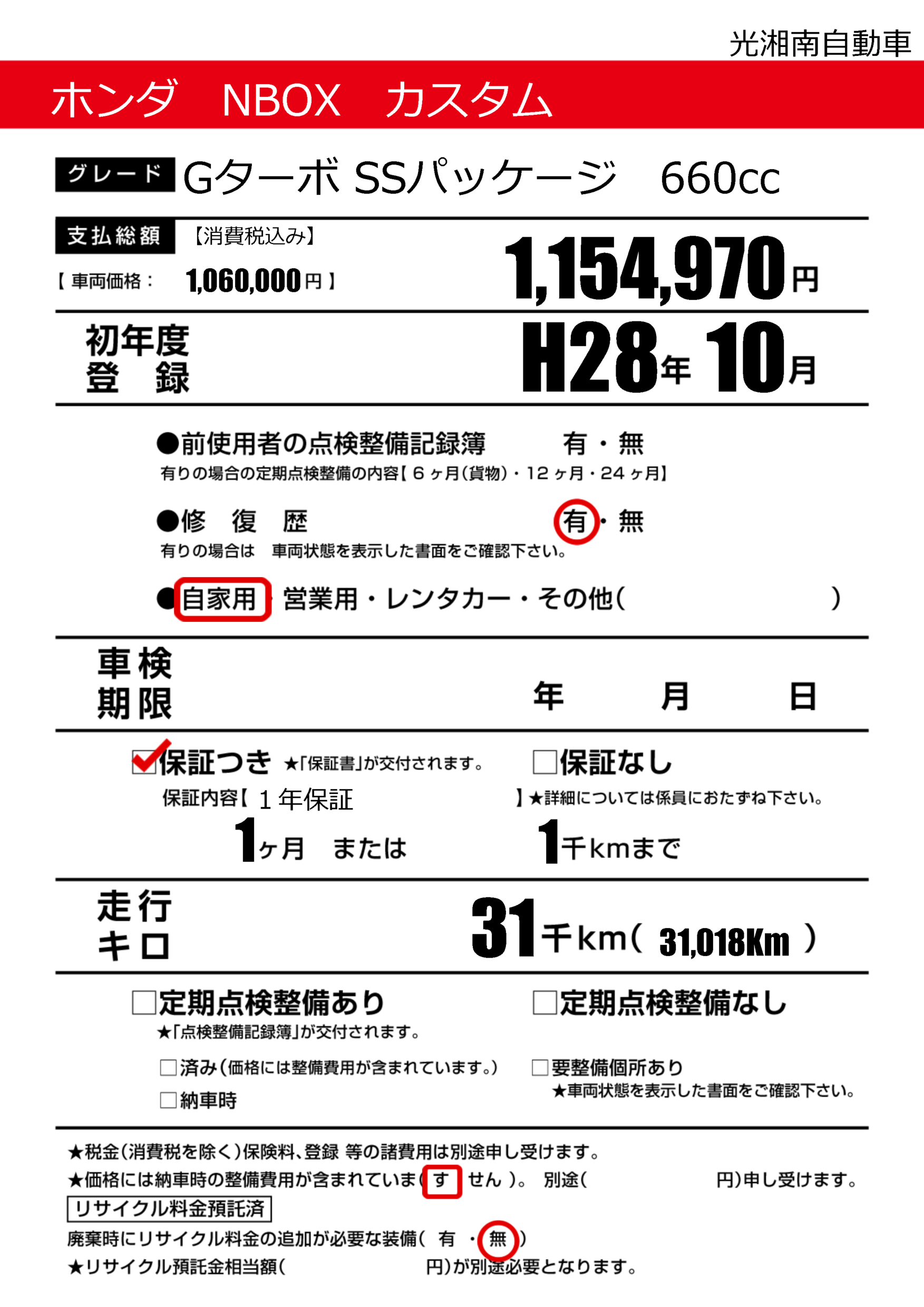| 走行キロ | 3.1万km | 初年度登録 | H28年10月 |