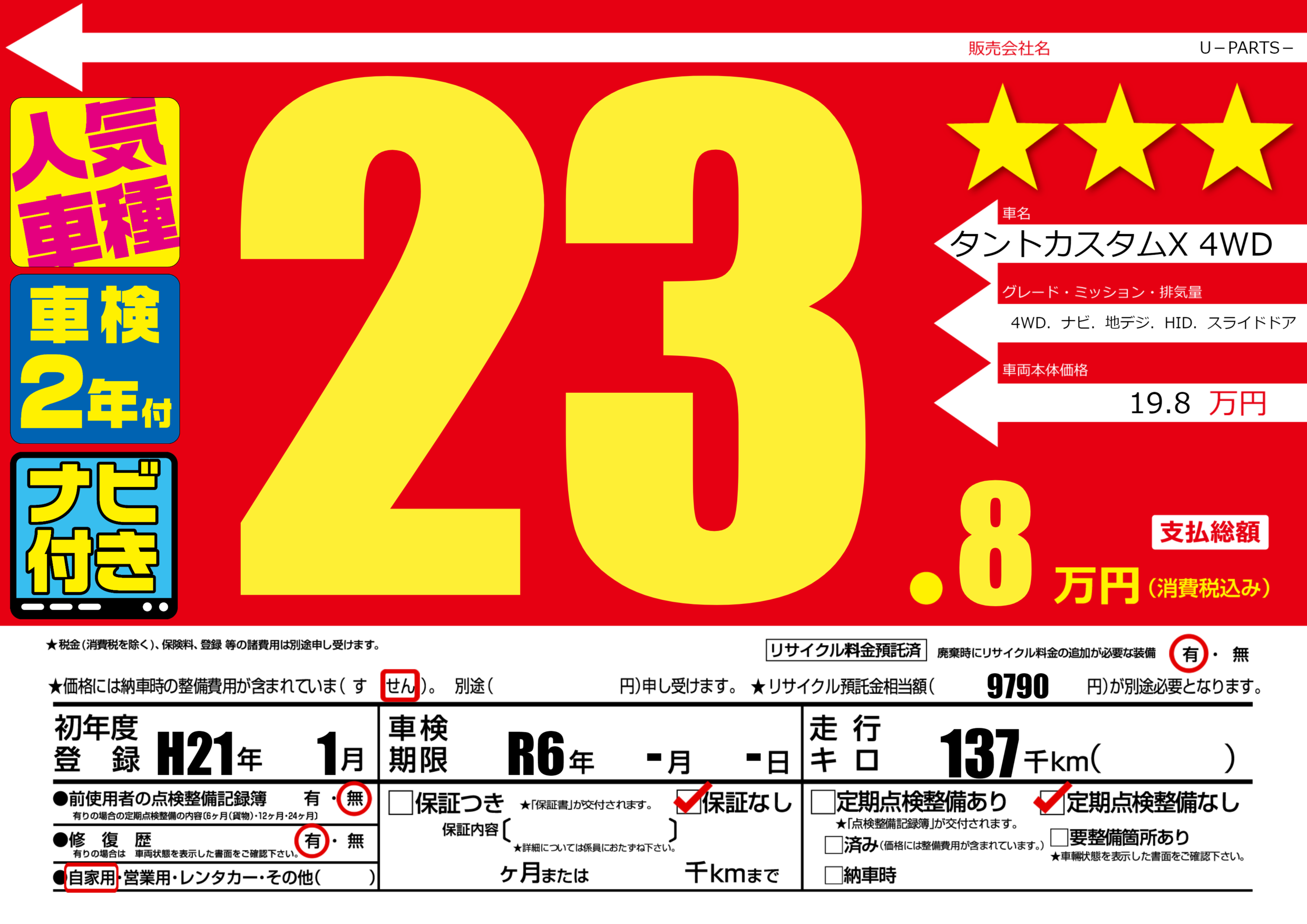 | 車名 | タントカスタムX 4WD | グレード ミッション 排気量 |