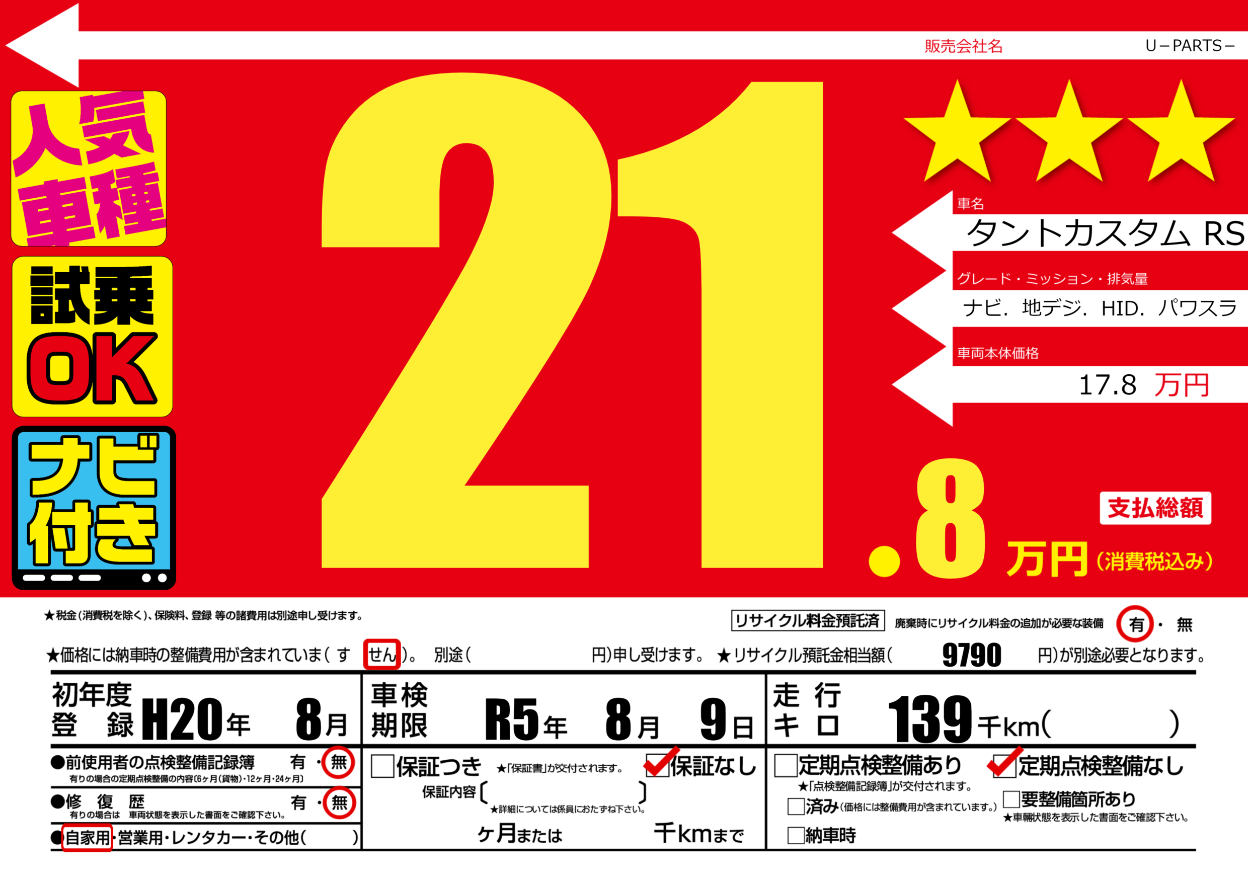 | 走行キロ | 13.9万km | 初年度登録 | H20年8月 |