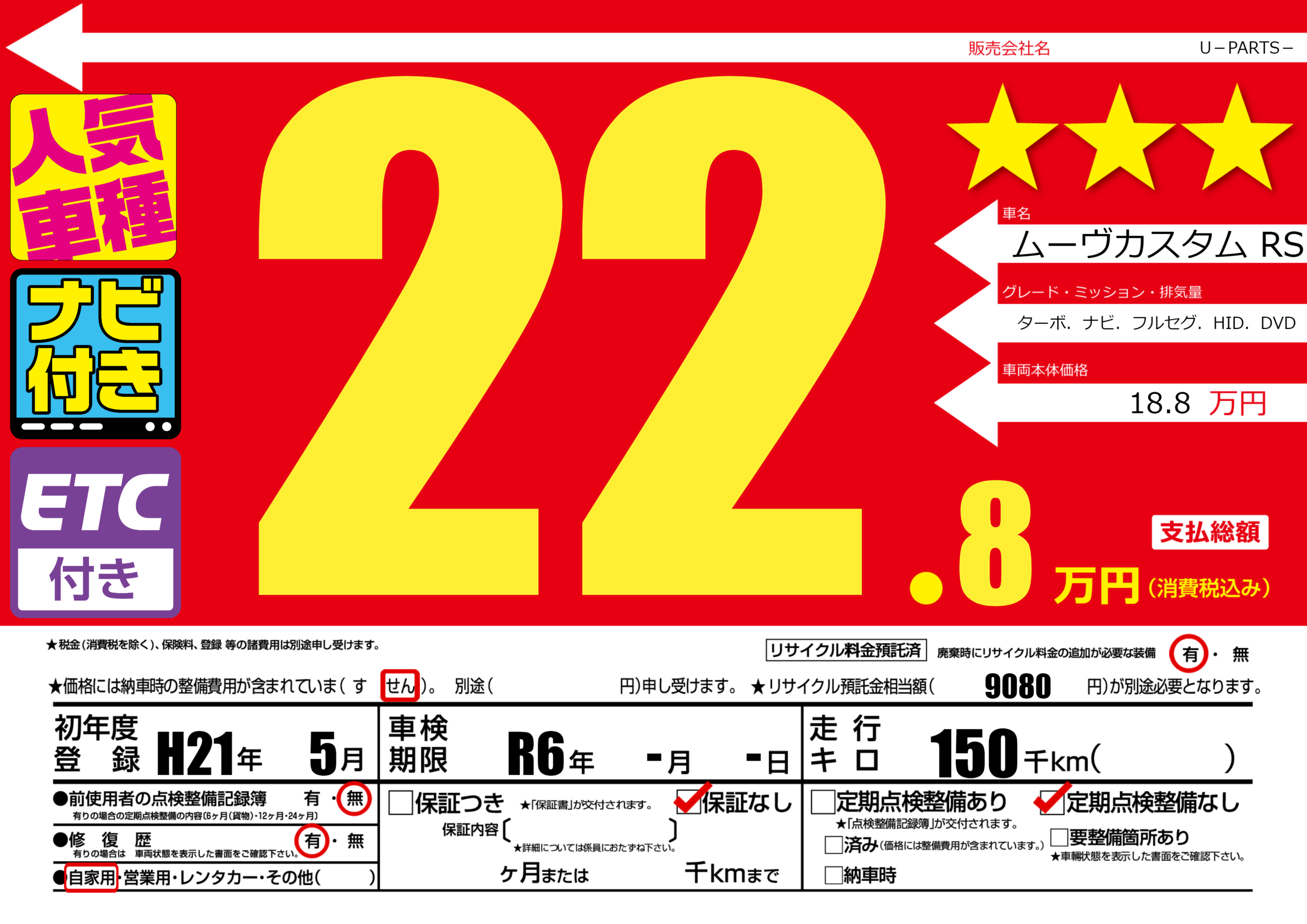 | 走行キロ | 15万km | 初年度登録 | H21年5月 |