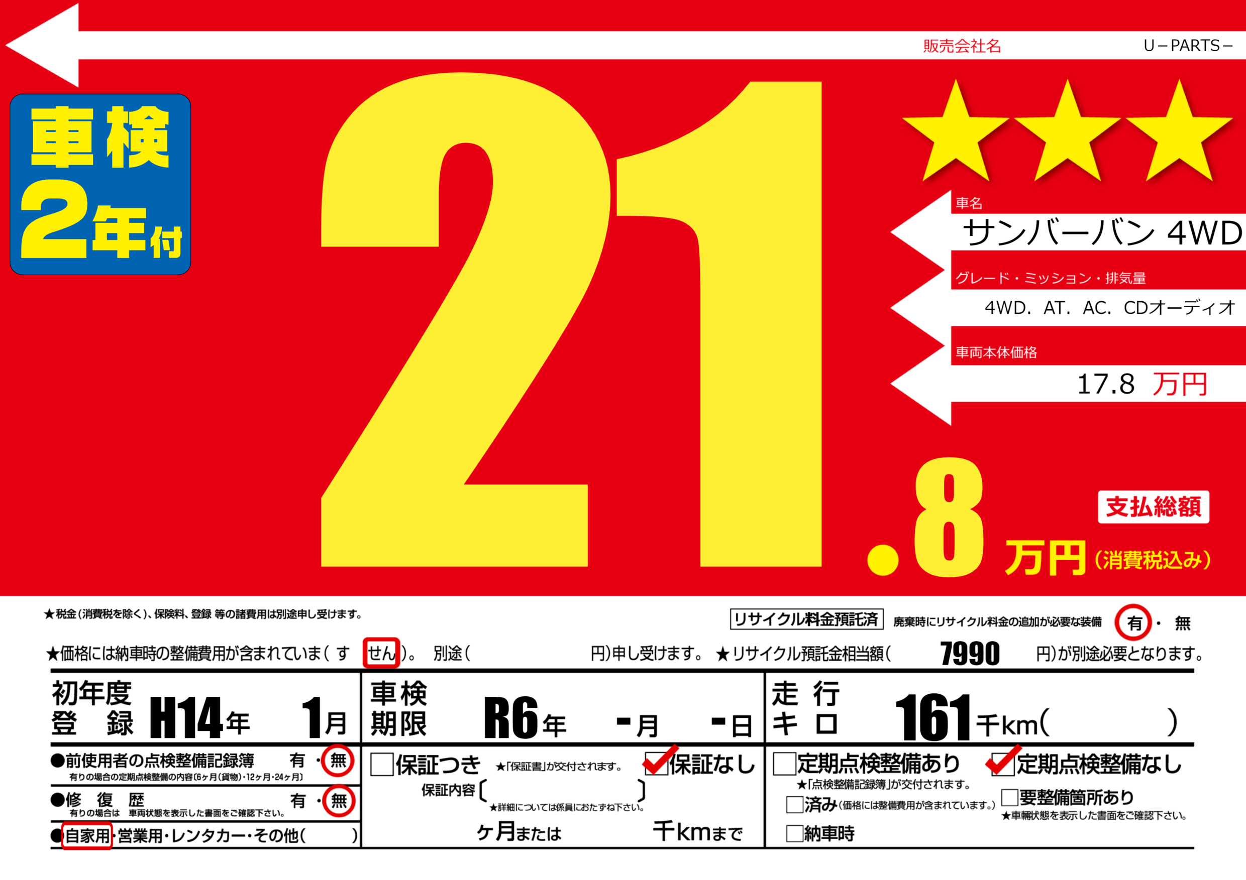 | 車名 | サンバーバン 4WD | グレード ミッション 排気量 |