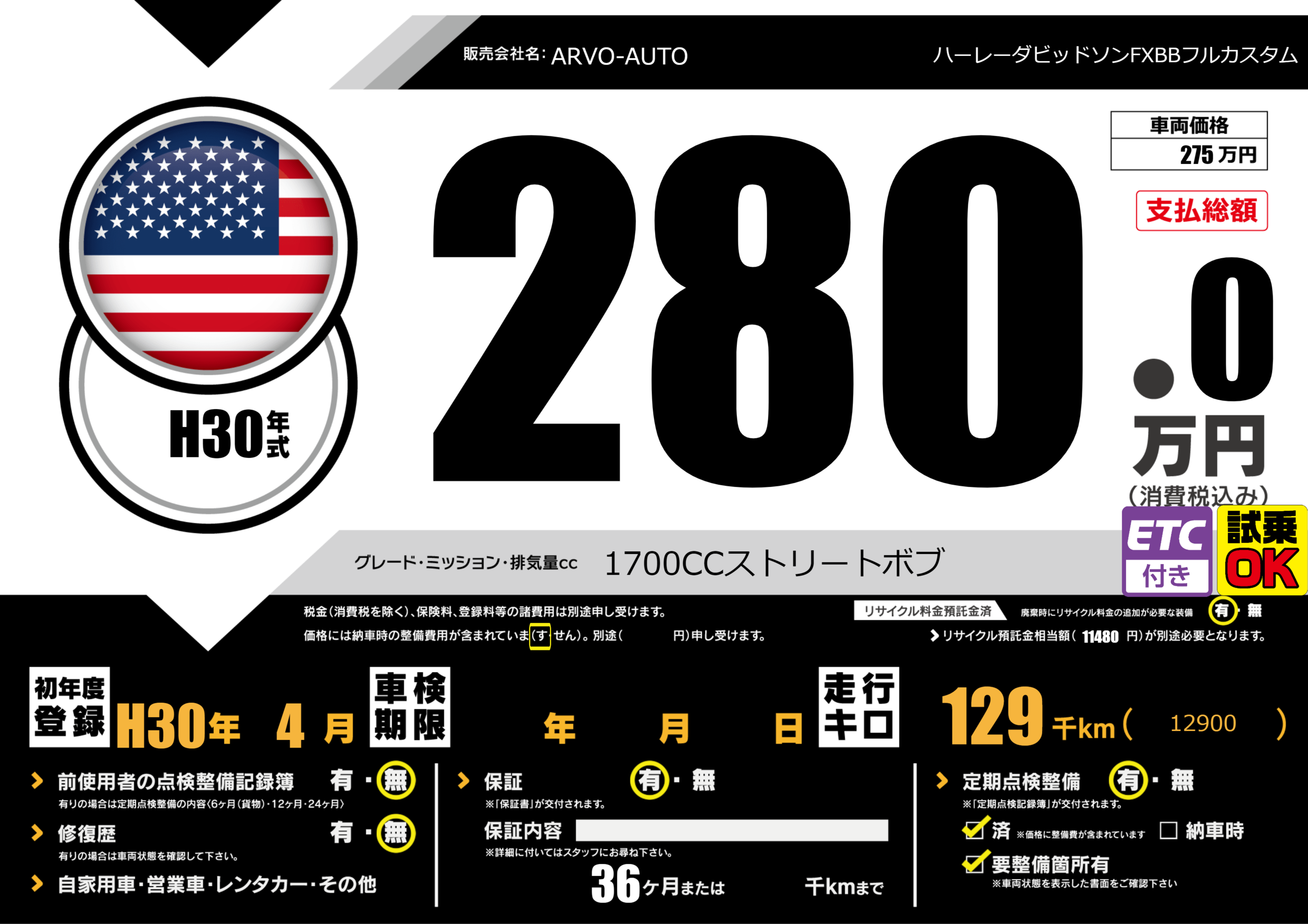 | 走行キロ | 12.9万km | 初年度登録 | H30年4月 |
