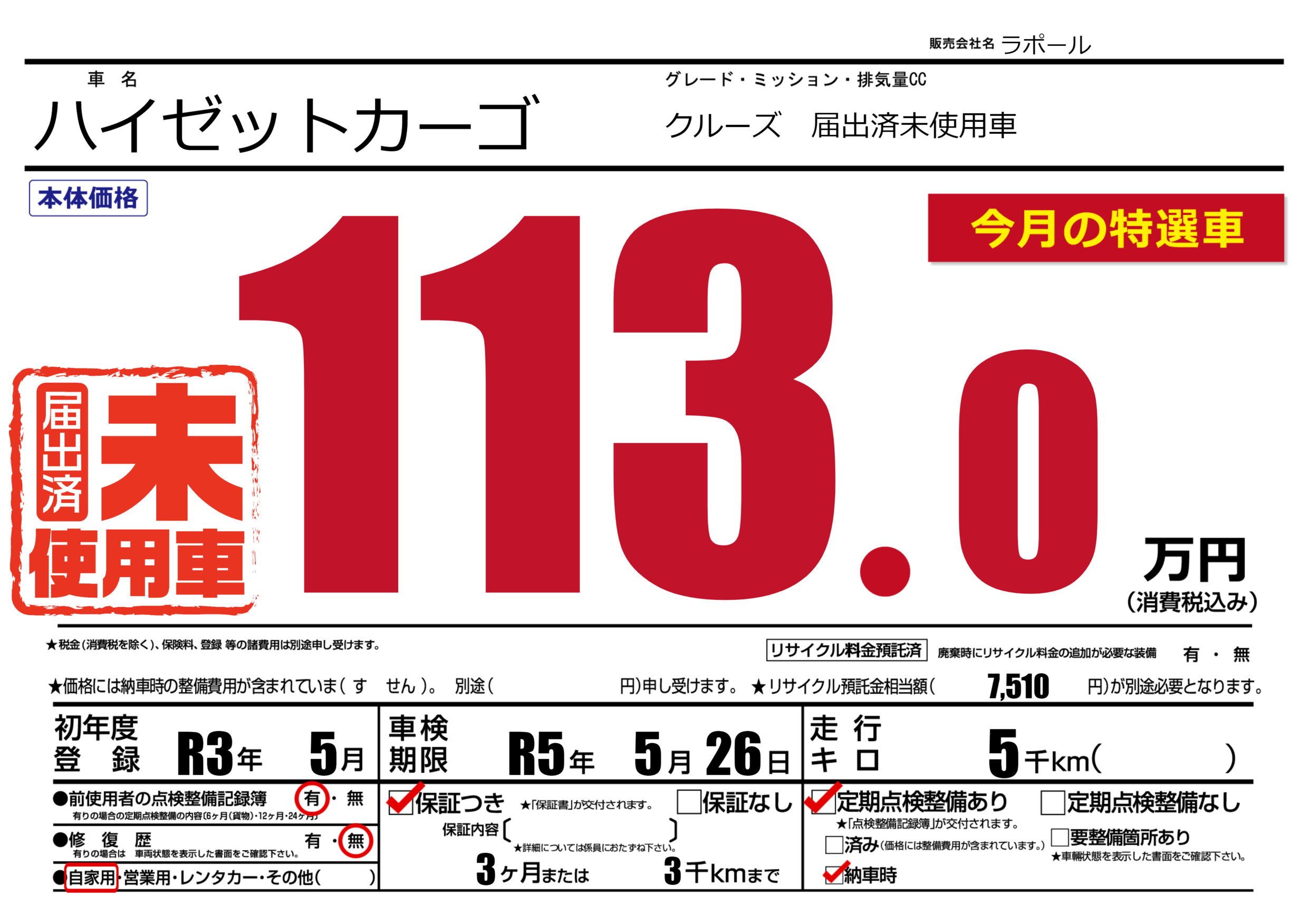 保証付き 保証内容(---) 3ヶ月または(3)千kmまで |