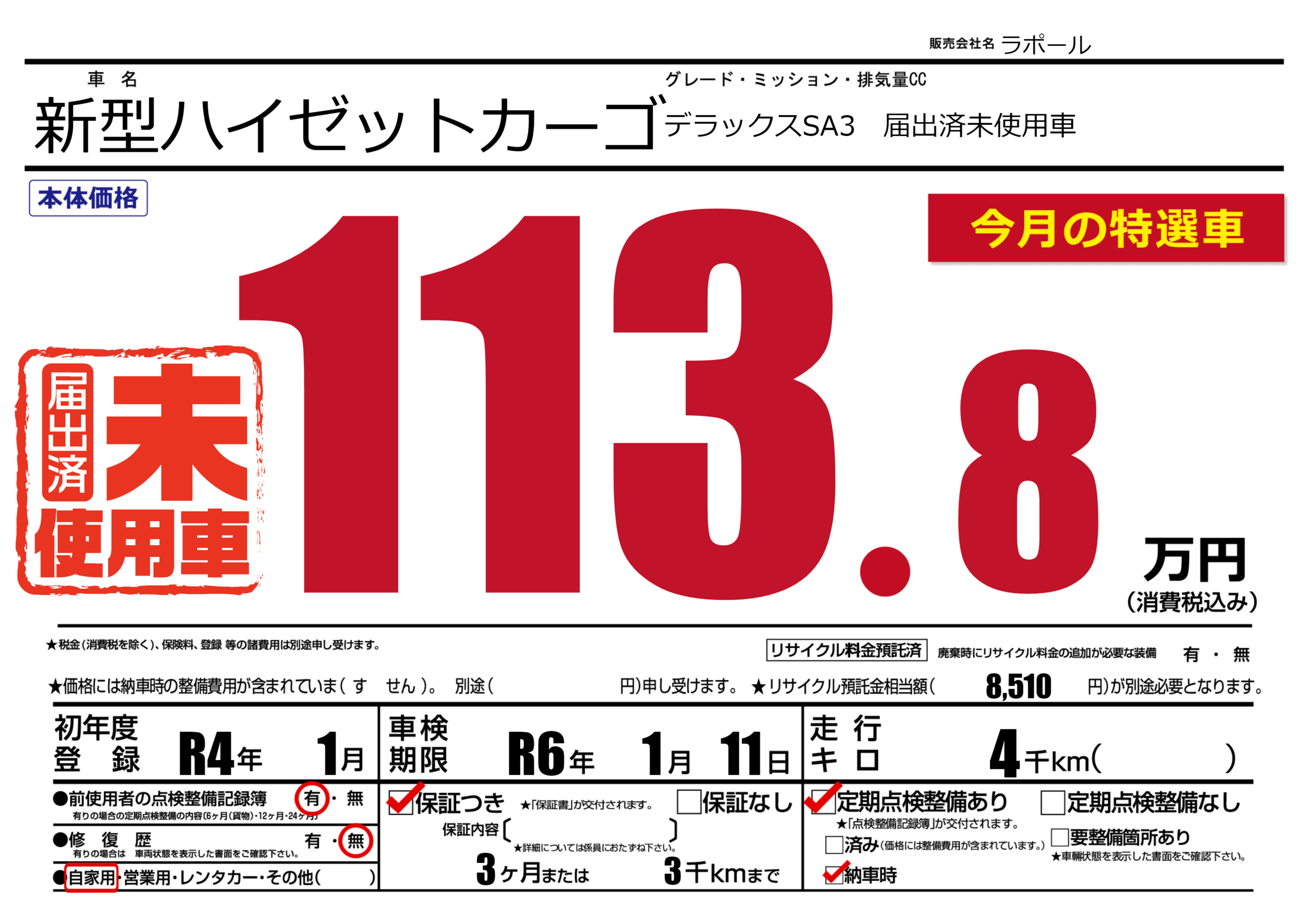 | 車名 | 新型ハイゼットカーゴ | グレード ミッション 排気量 |