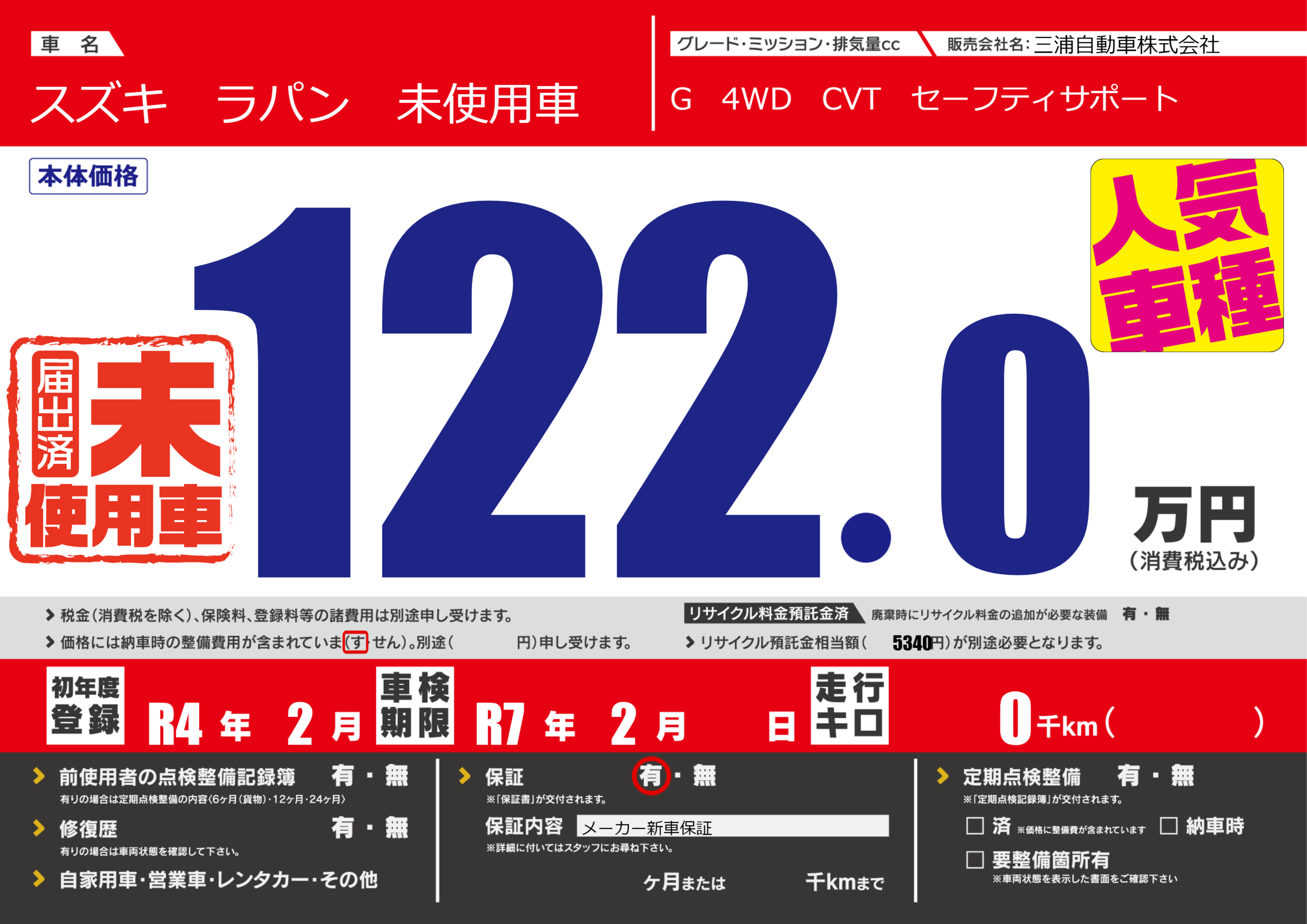 保証付き 保証内容(メーカー新車保証) ---ヶ月または()千kmまで |