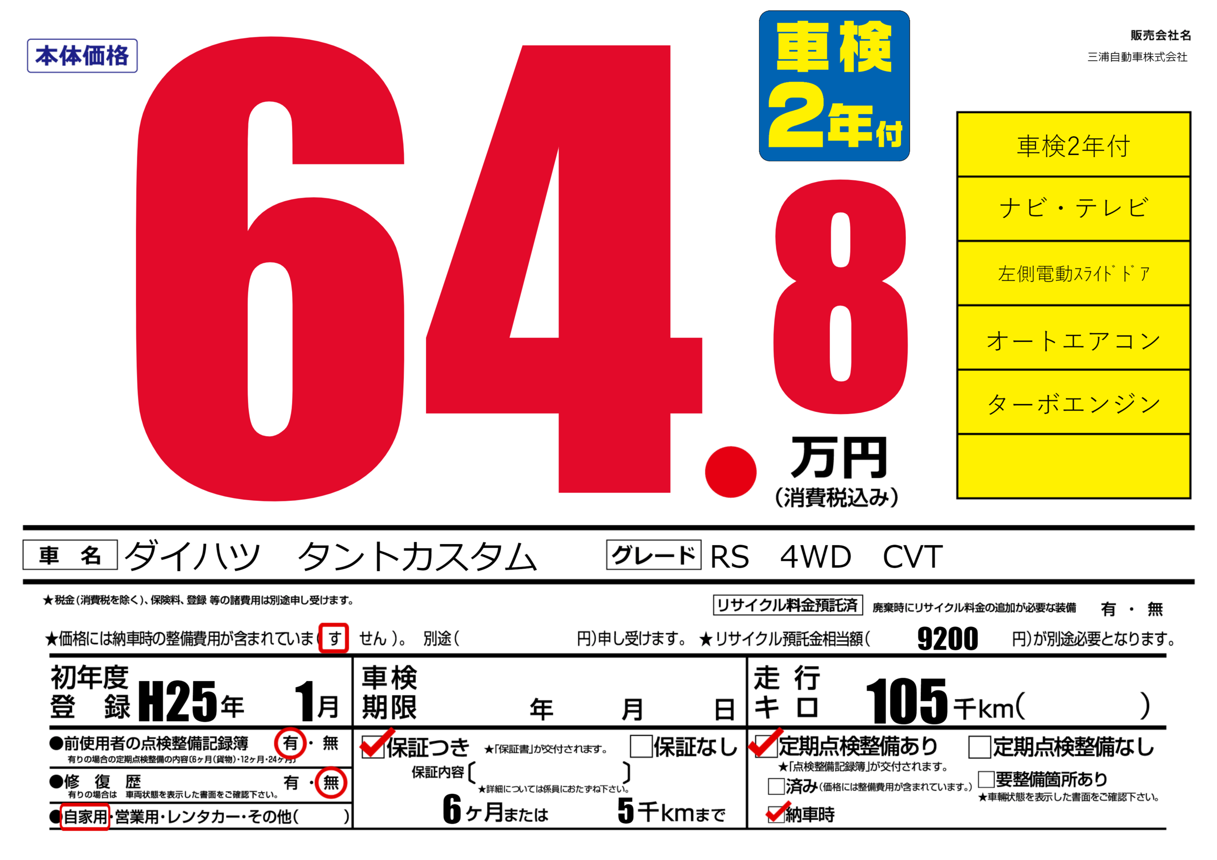 | 定期点検整備 | 定期点検整備あり 納車時あり | ||