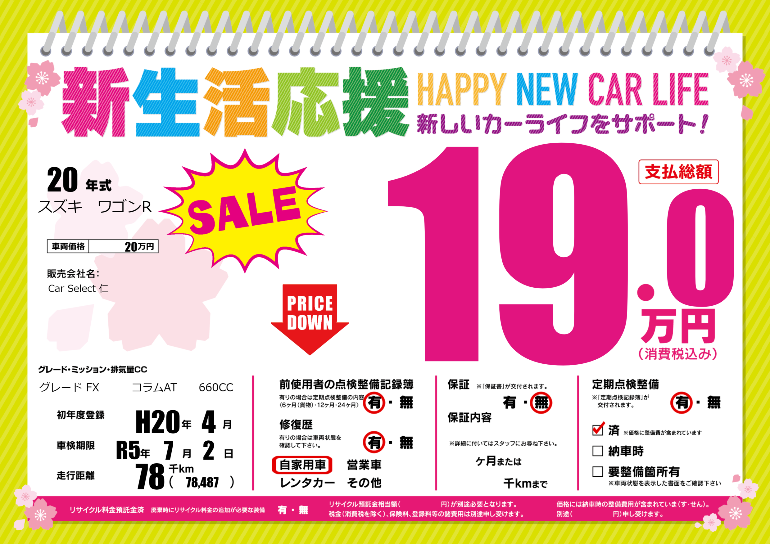 | 車名 | スズキ ワゴンR (売約済) | グレード ミッション 排気量 |