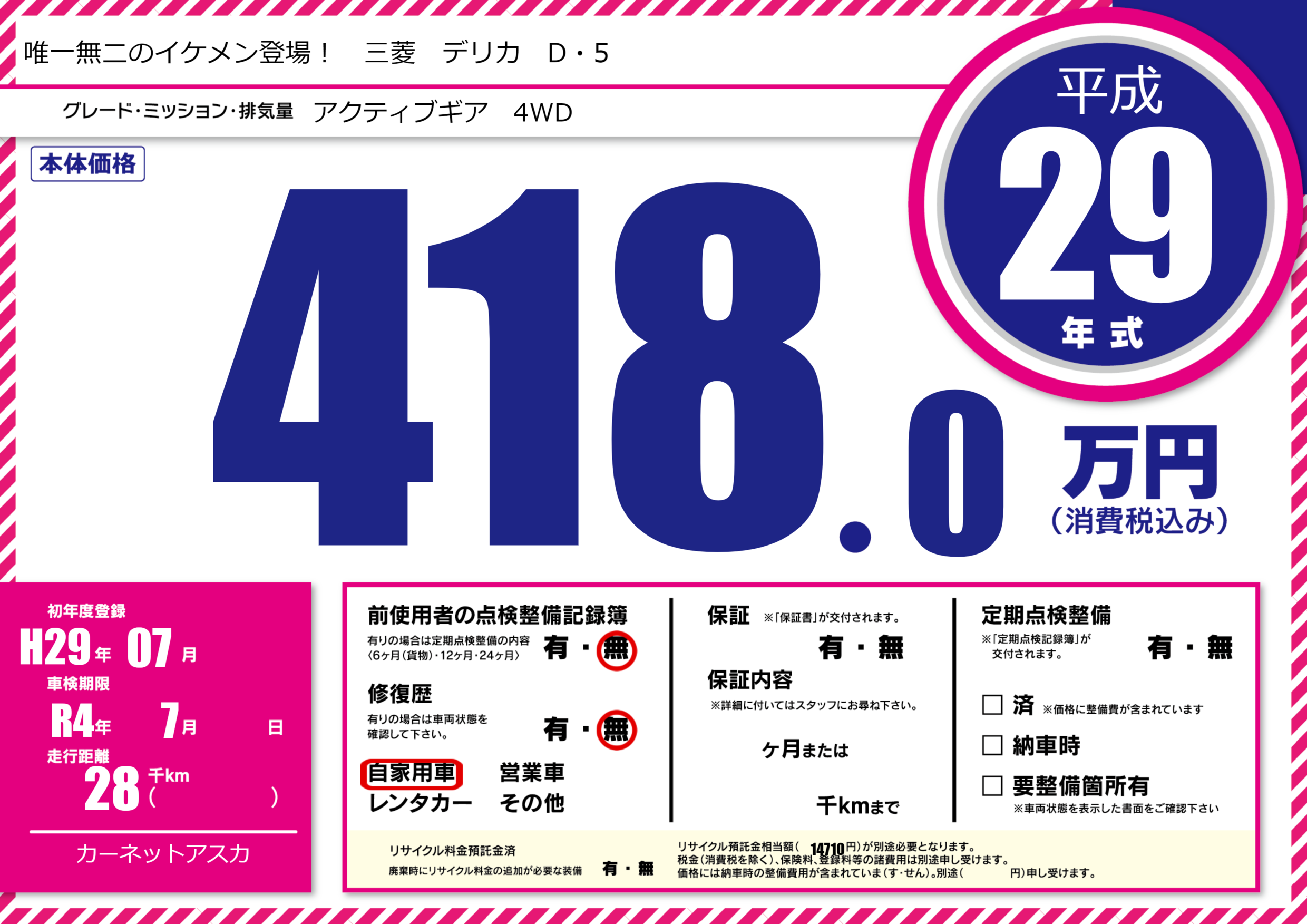 | 車名 | 唯一無二のイケメン登場! 三菱 デリカ D・5 | グレード ミッション 排気量 |