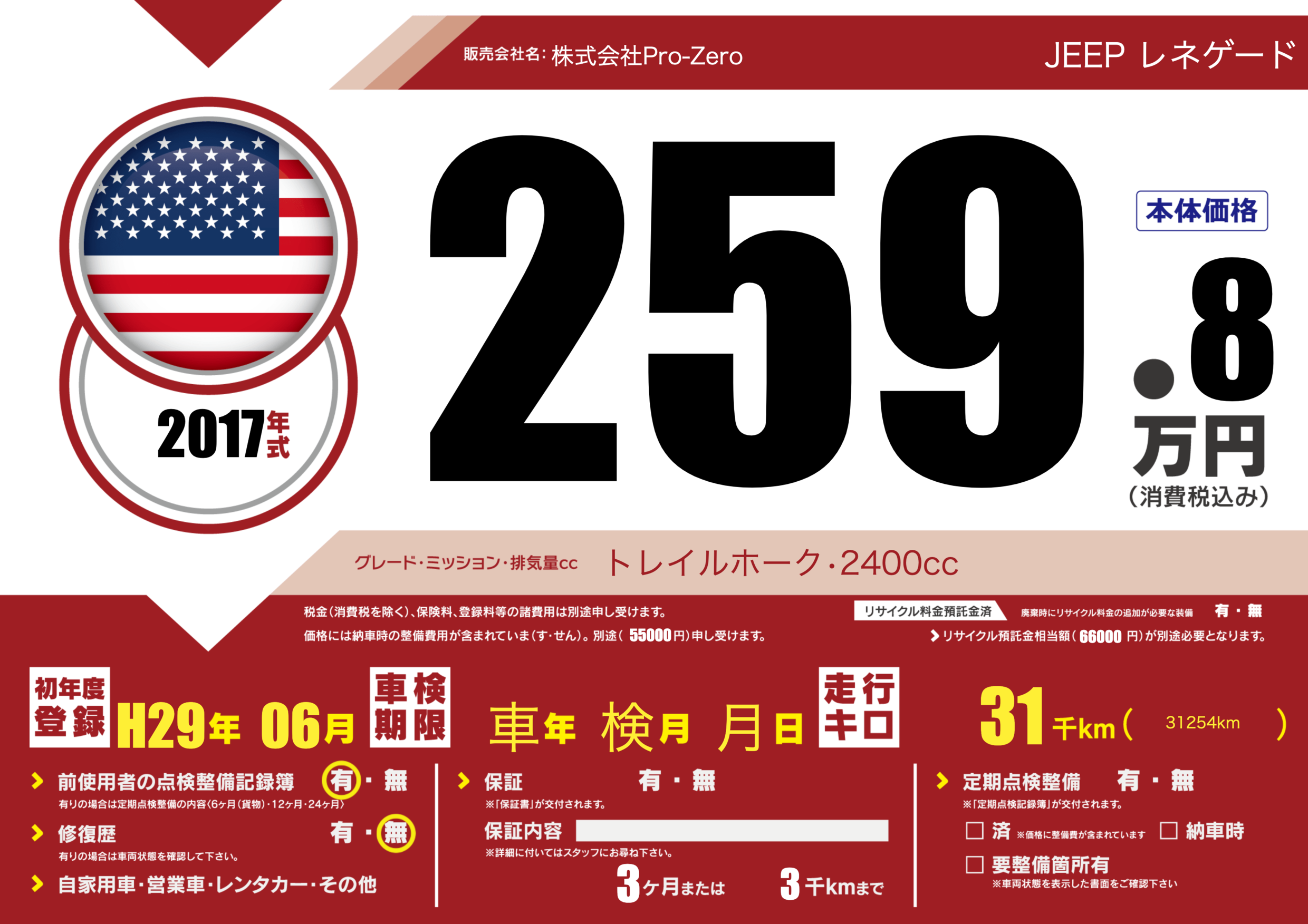 | 車名 | JEEP レネゲード | グレード ミッション 排気量 |