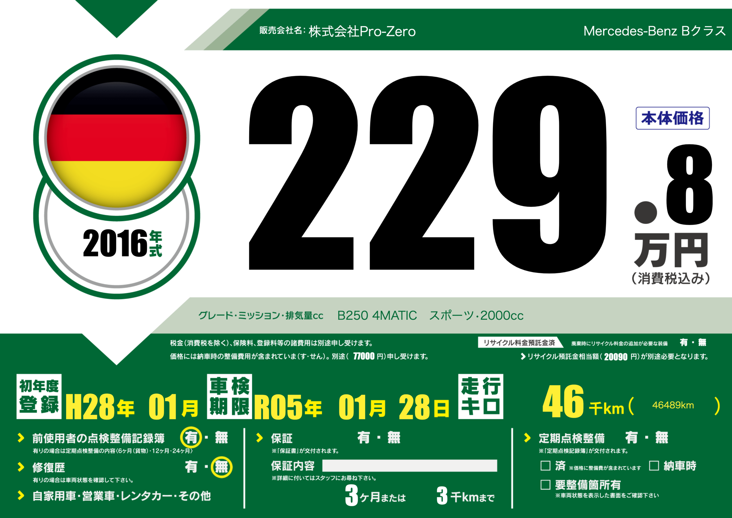 | 車名 | Mercedes-Benz Bクラス | グレード ミッション 排気量 |