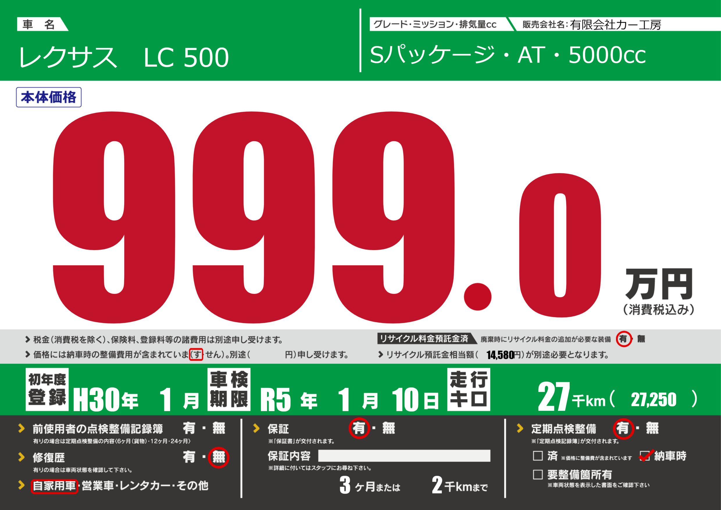 | 車名 | レクサス LC 500 | グレード ミッション 排気量 |