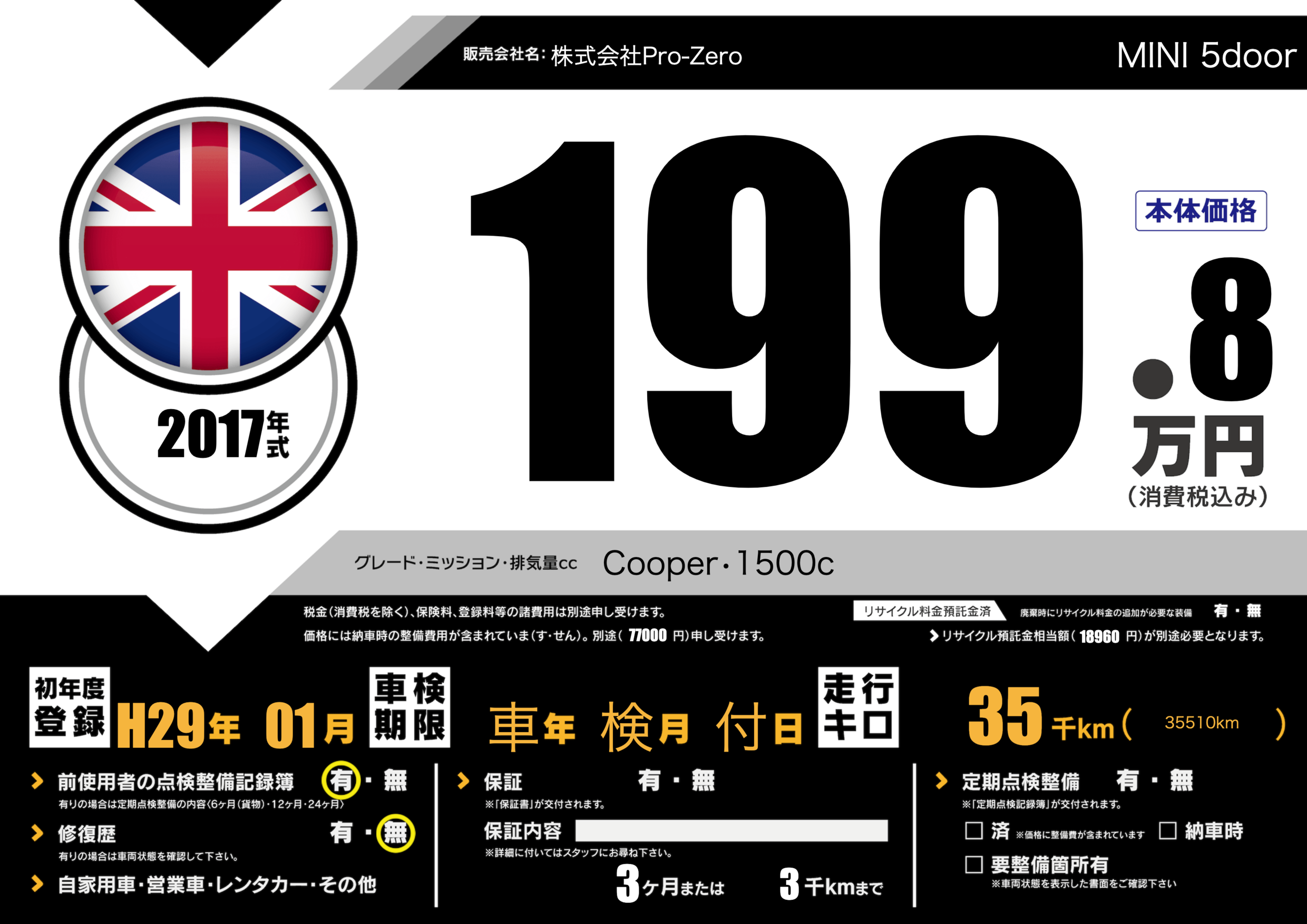 | 走行キロ | 3.5万km | 初年度登録 | H29年01月 |