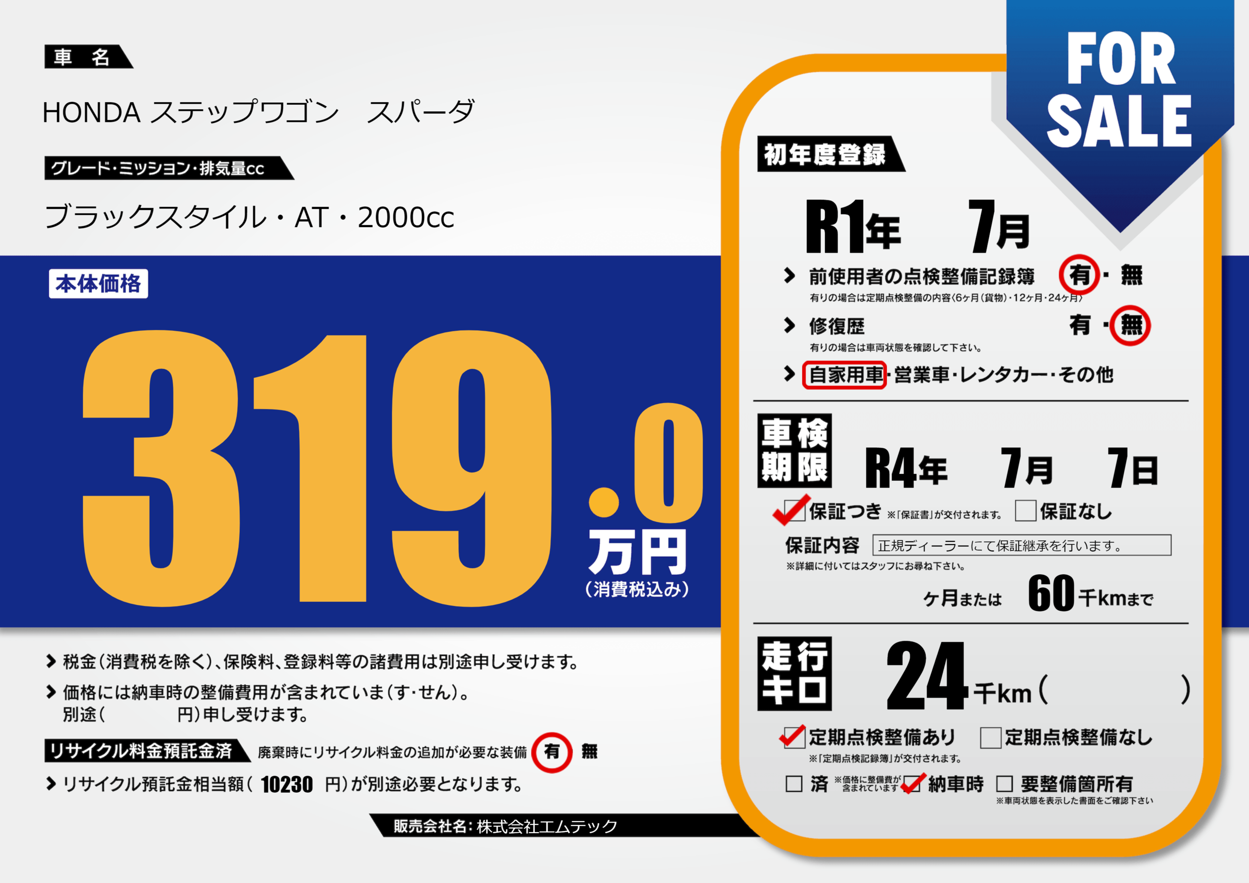 | 車名 | HONDA ステップワゴン スパーダ | グレード ミッション 排気量 |