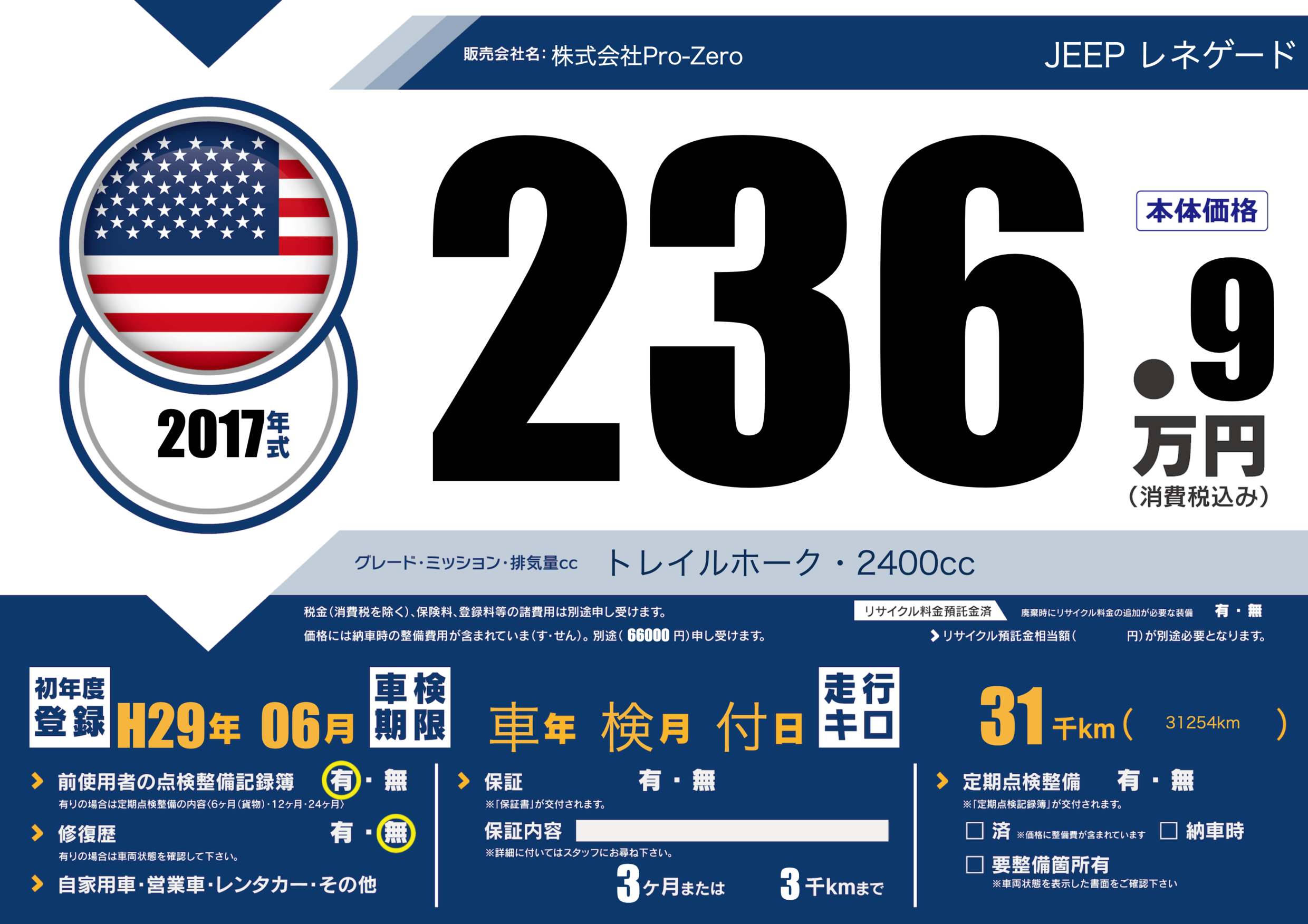| 車名 | JEEP レネゲード | グレード ミッション 排気量 |