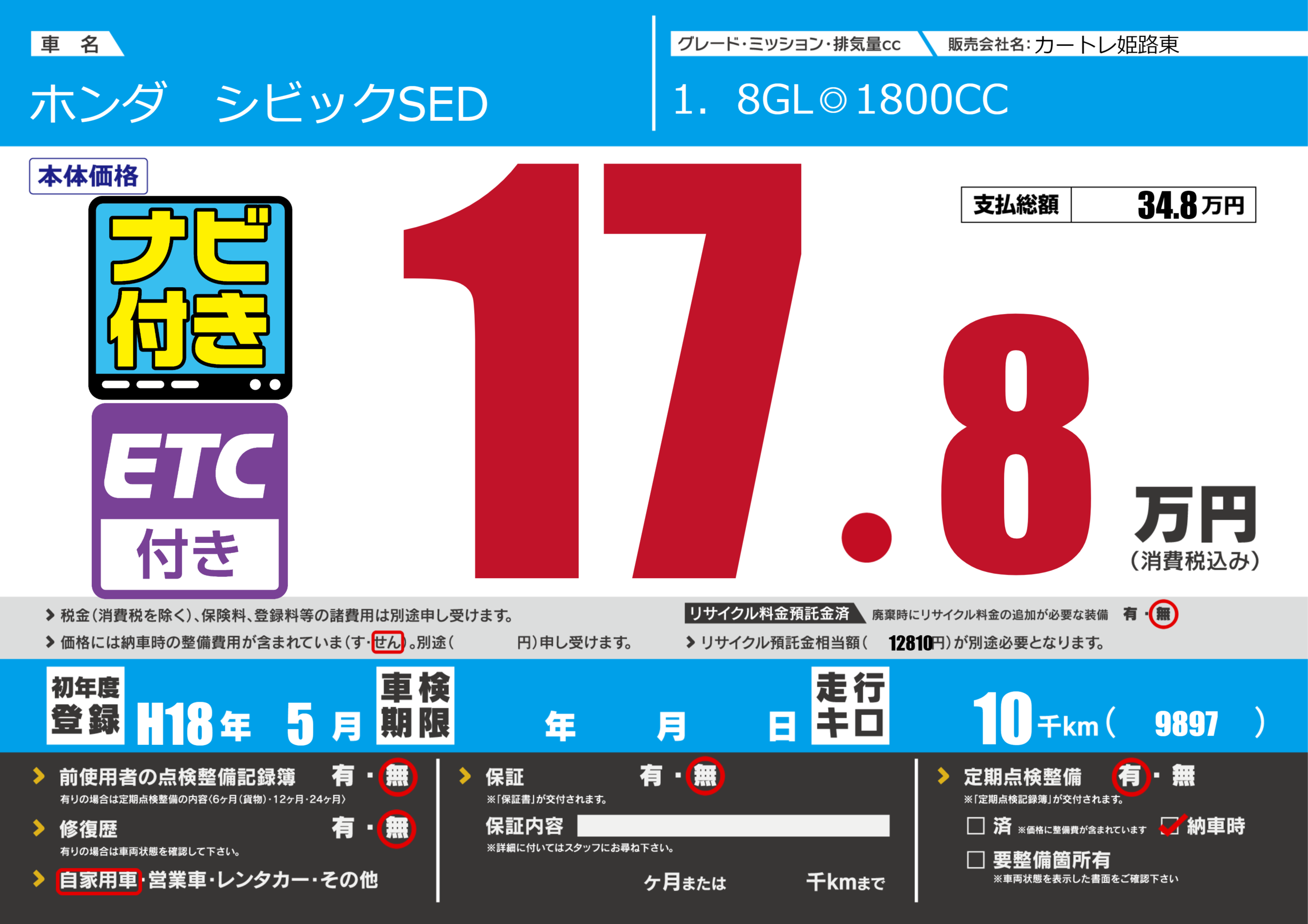 | 車名 | ホンダ シビックSED | グレード ミッション 排気量 |