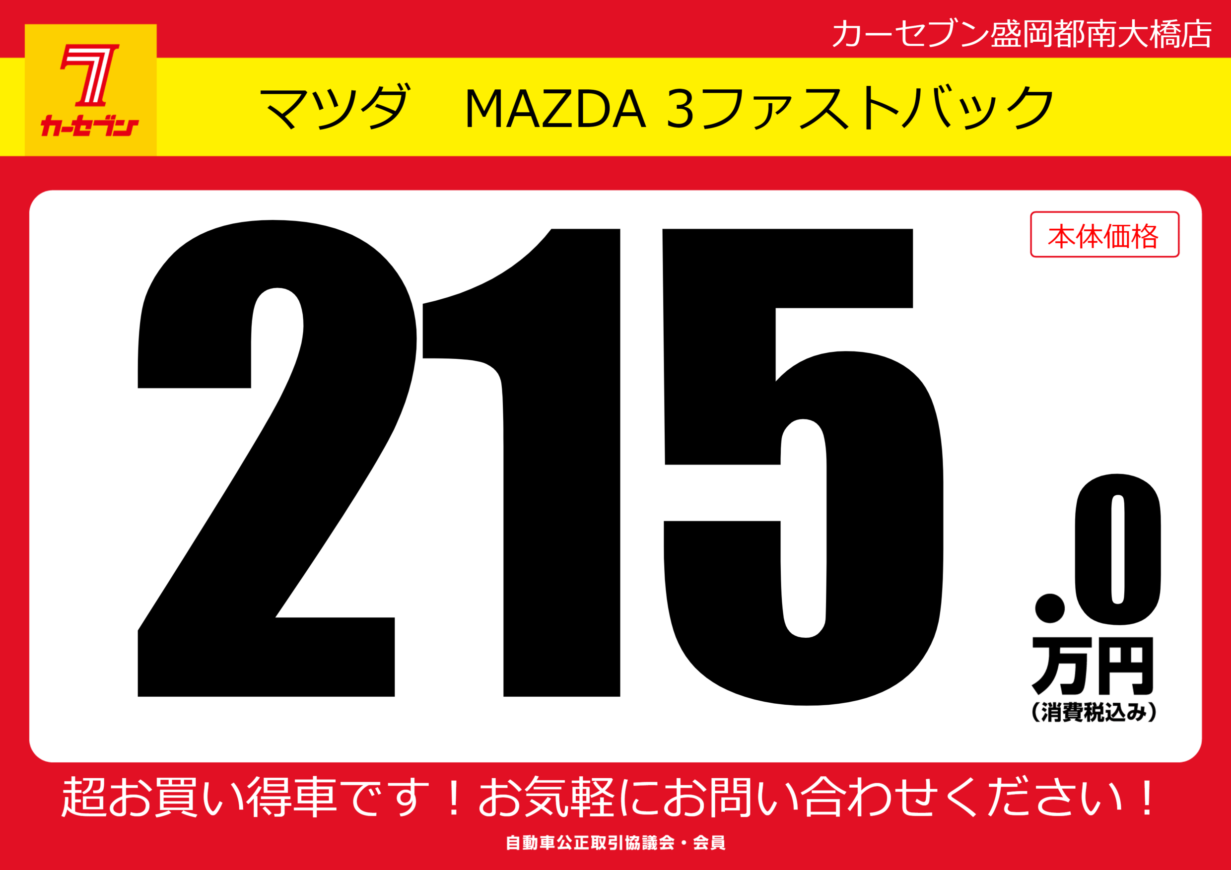 | 車名 | マツダ MAZDA 3ファストバック | グレード ミッション 排気量 |
