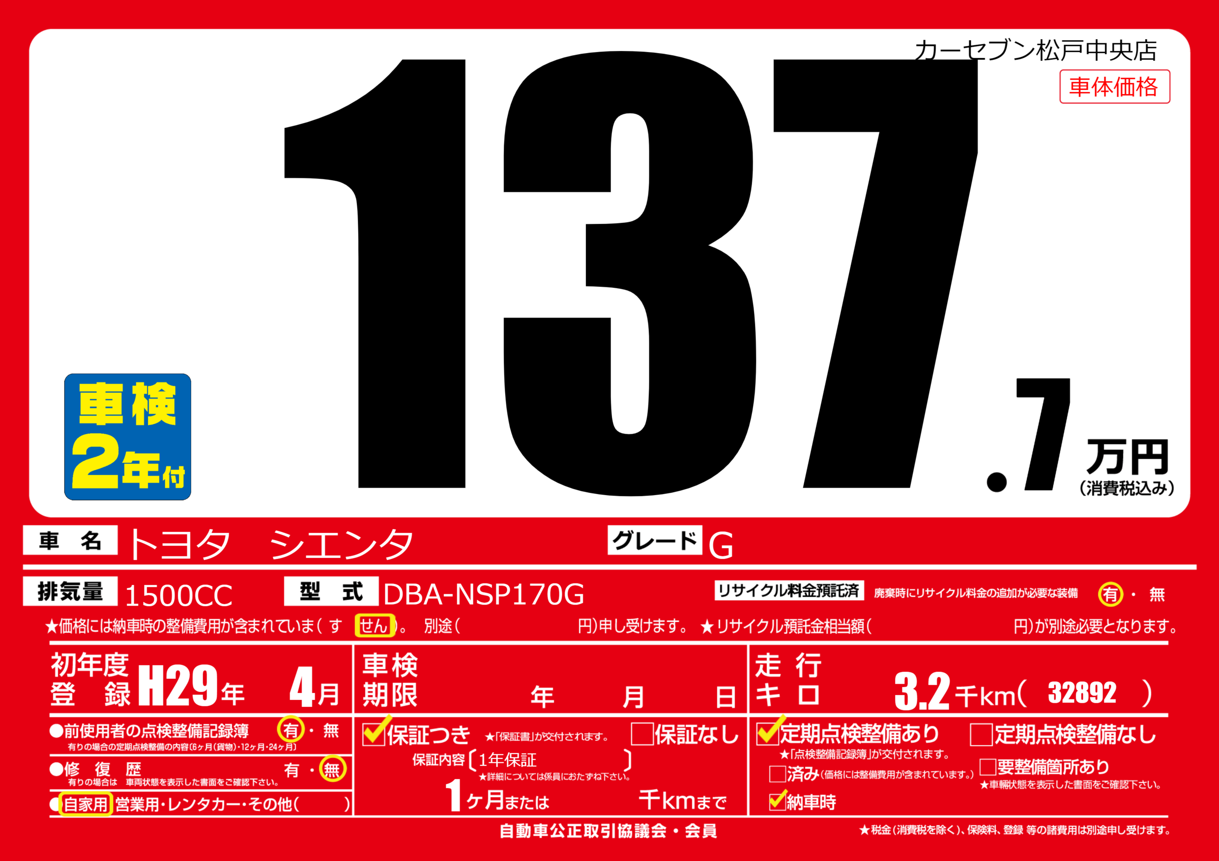 | 車名 | トヨタ シエンタ | グレード ミッション 排気量 |