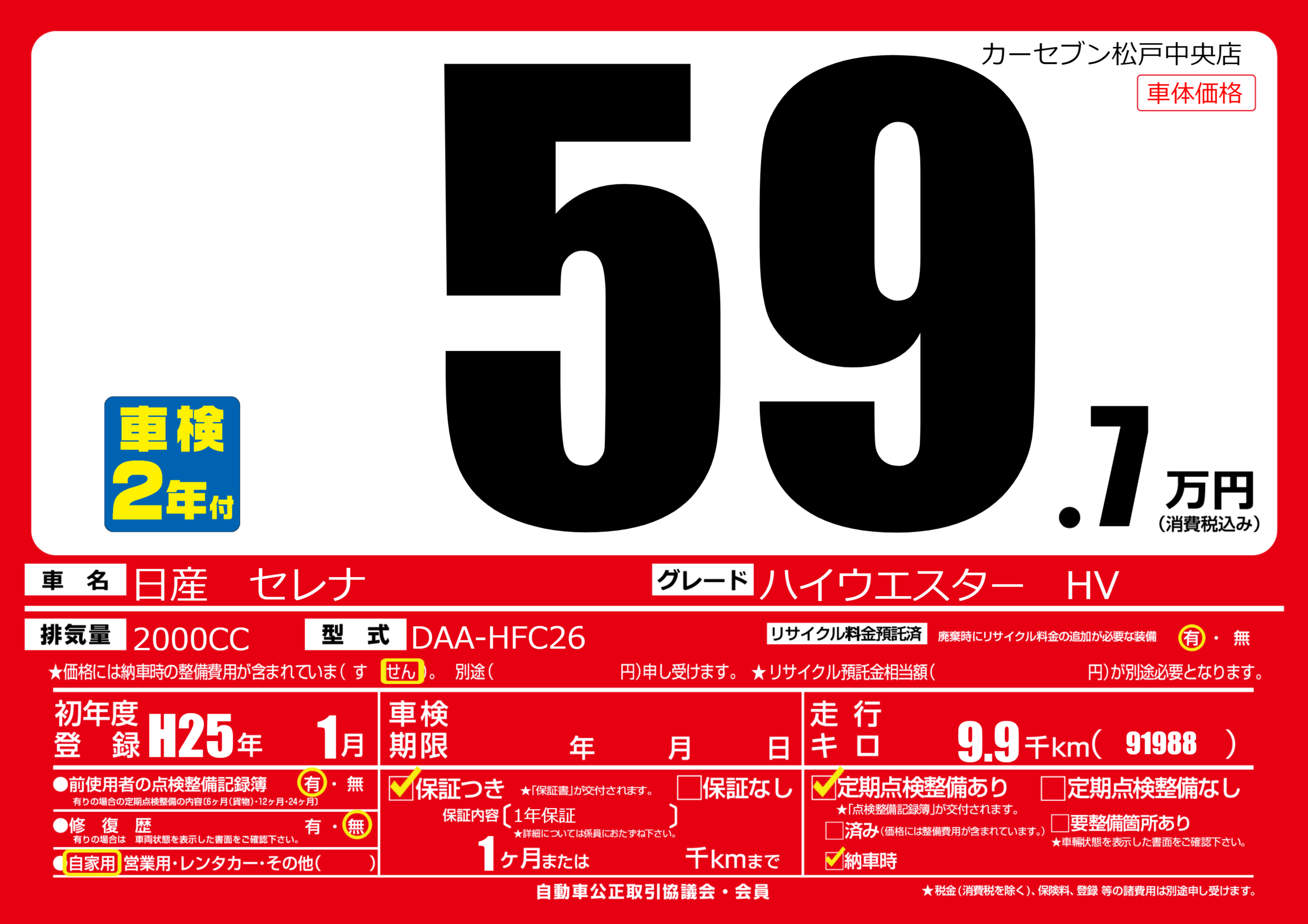 | 車名 | 日産 セレナ | グレード ミッション 排気量 |