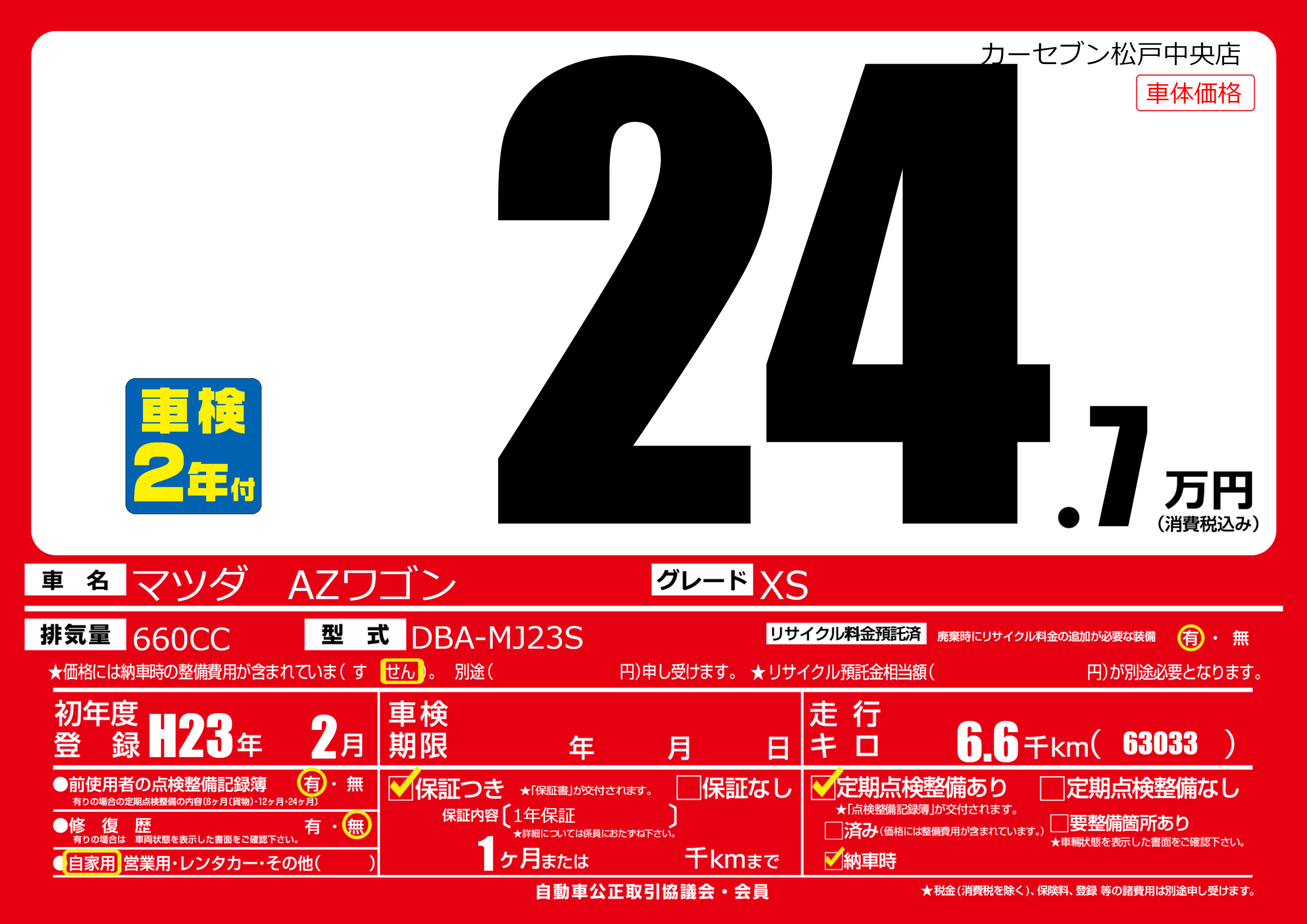 | 車名 | マツダ AZワゴン | グレード ミッション 排気量 |