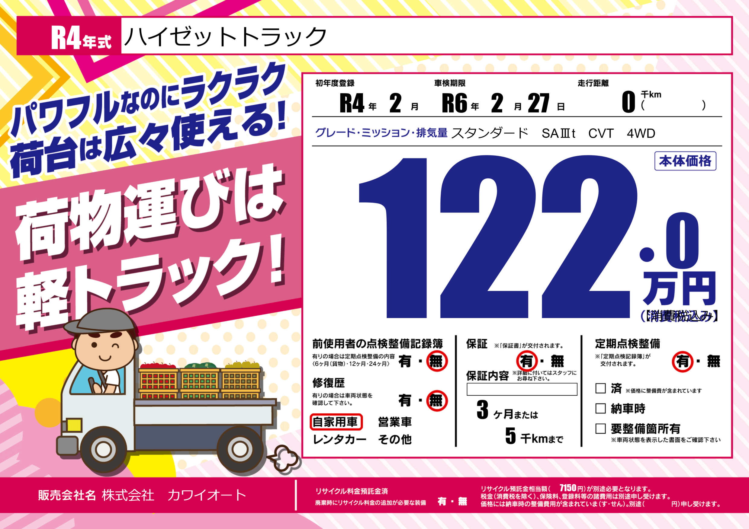 | 車名 | ハイゼットトラック | グレード ミッション 排気量 |